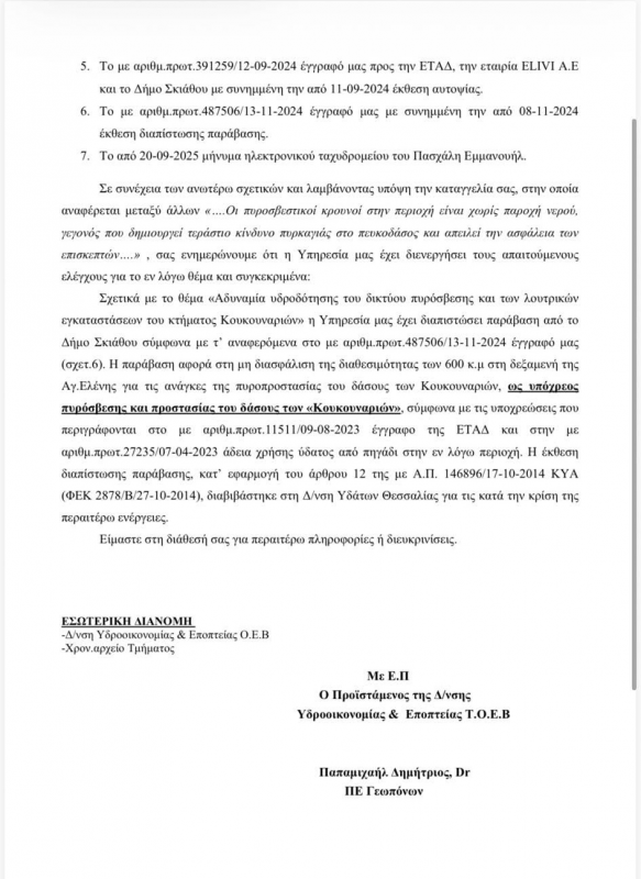 Η κοινωνία της Σκιάθου και οι αρμόδιοι φορείς καλούνται πλέον να δώσουν απαντήσεις: ποιος αναλαμβάνει την ευθύνη αν αύριο ξεσπάσει πυρκαγιά; Ποιος λογοδοτεί για την έλλειψη των στοιχειωδών μέτρων προστασίας;