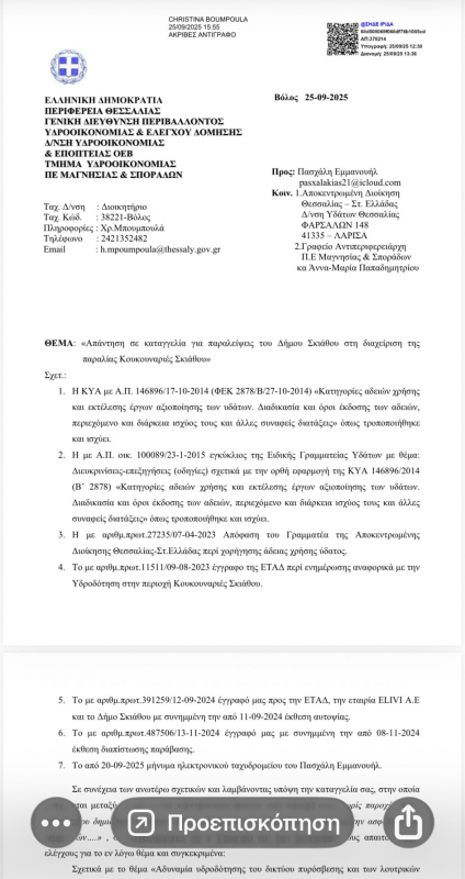 Σύμφωνα με επίσημα έγγραφα της Περιφέρειας Θεσσαλίας, που παρουσίασε ο Δημοτικός Σύμβουλος της μειοψηφίας κ. Μανώλης Πασχάλης, οι πυροσβεστικοί κρουνοί στην περιοχή «είναι χωρίς παροχή νερού», με αποτέλεσμα να ελλοχεύει διαρκώς ο κίνδυνος πυρκαγιάς σε ένα από τα σημαντικότερα πευκοδάση του Αιγαίου. Η εικόνα αυτή, όπως καταγράφεται σε αυτοψίες και εκθέσεις διαπίστωσης παραβάσεων, δεν αποτελεί απλώς διοικητική αμέλεια. Συνιστά ευθεία απειλή για την ασφάλεια των επισκεπτών, αλλά και για την ίδια την ύπαρξη του προστατευμένου δάσους.