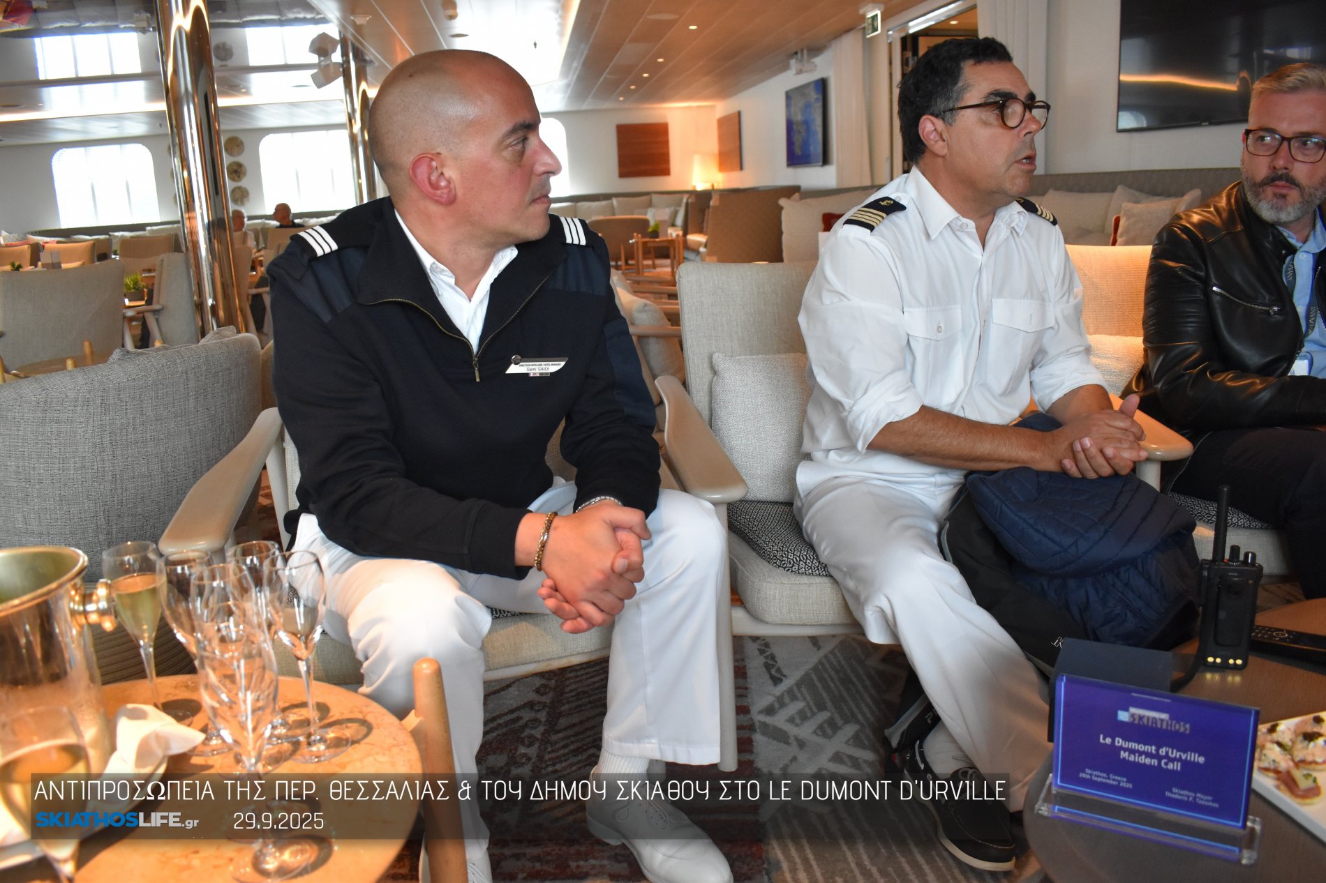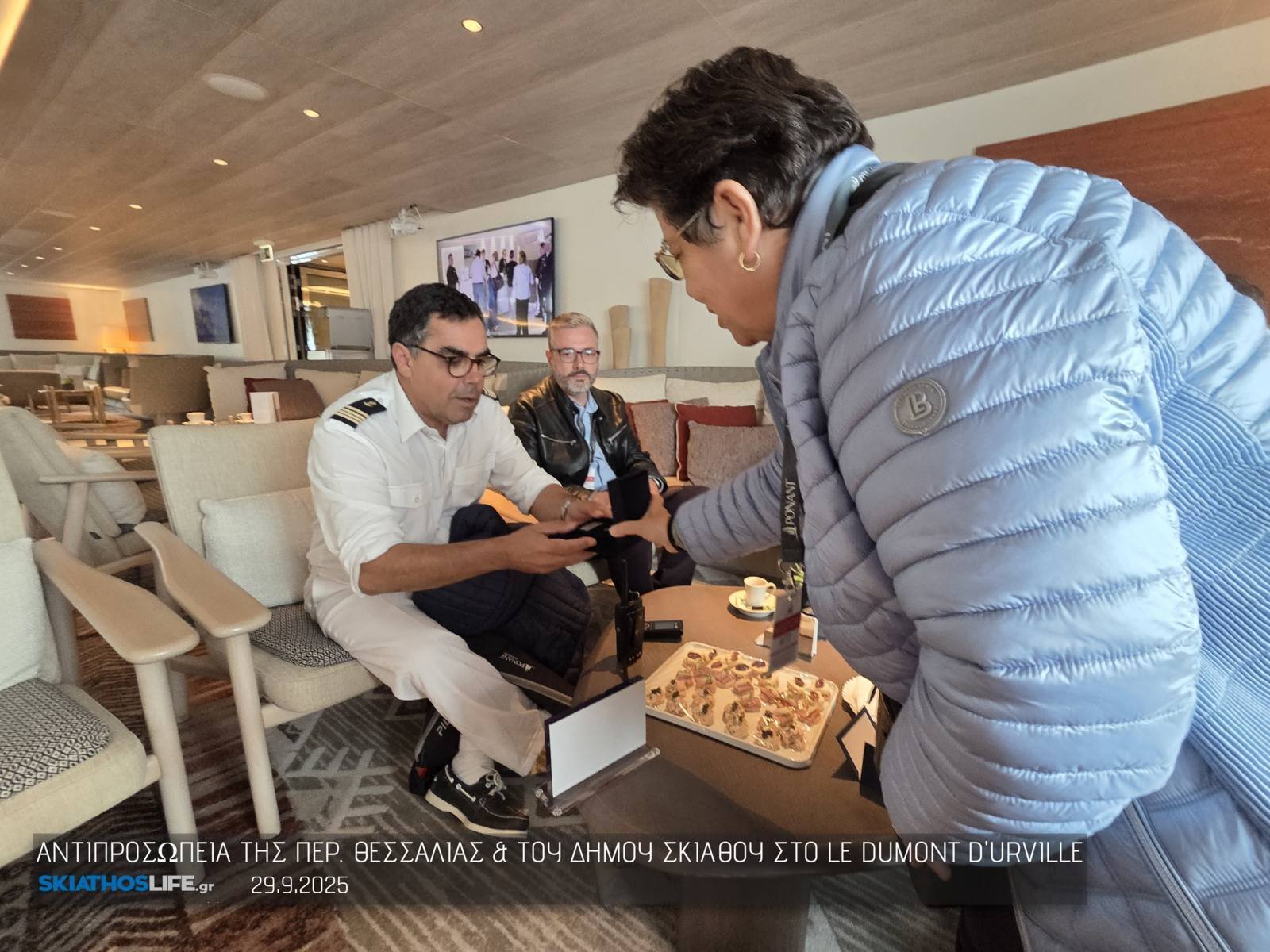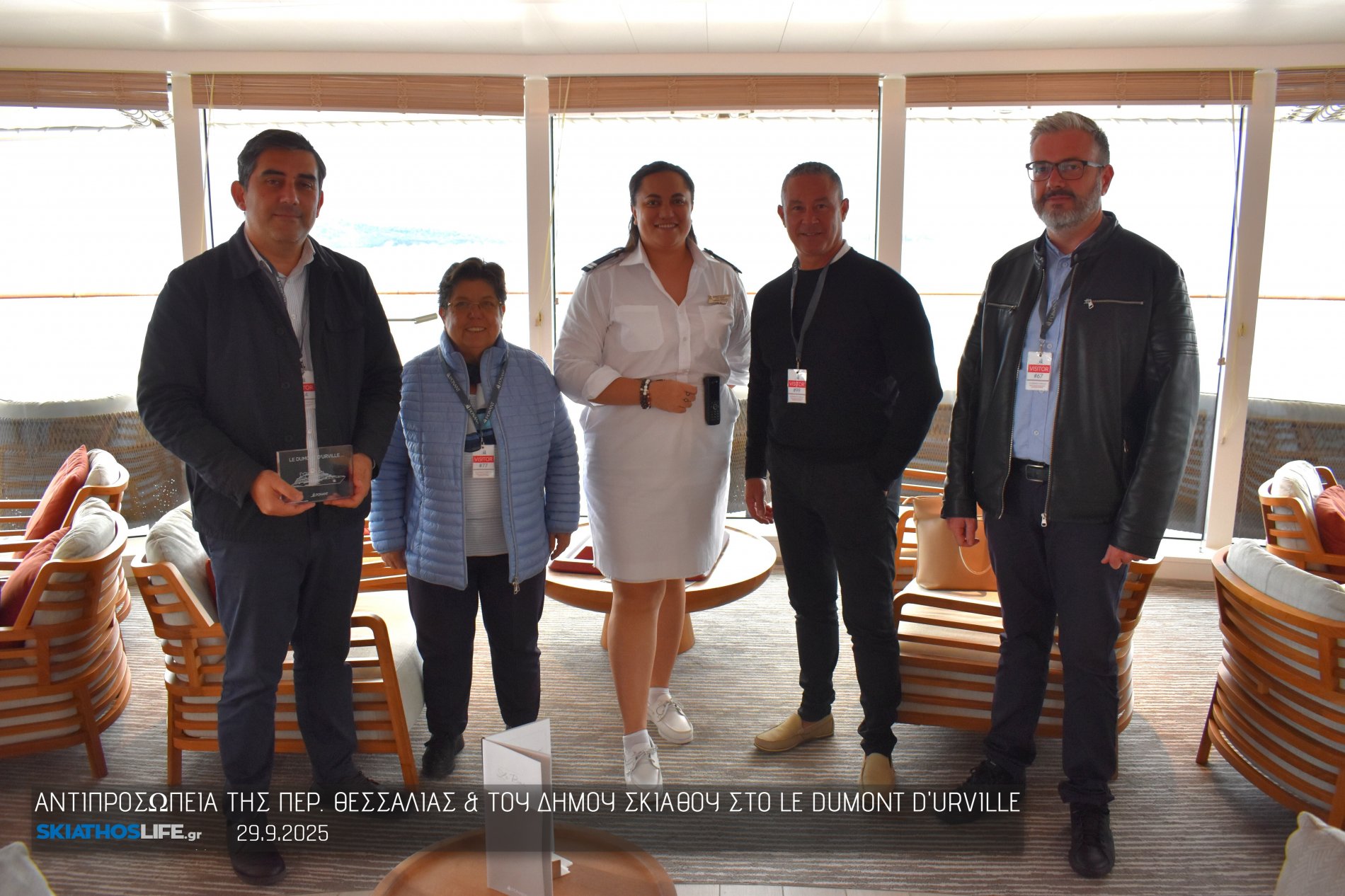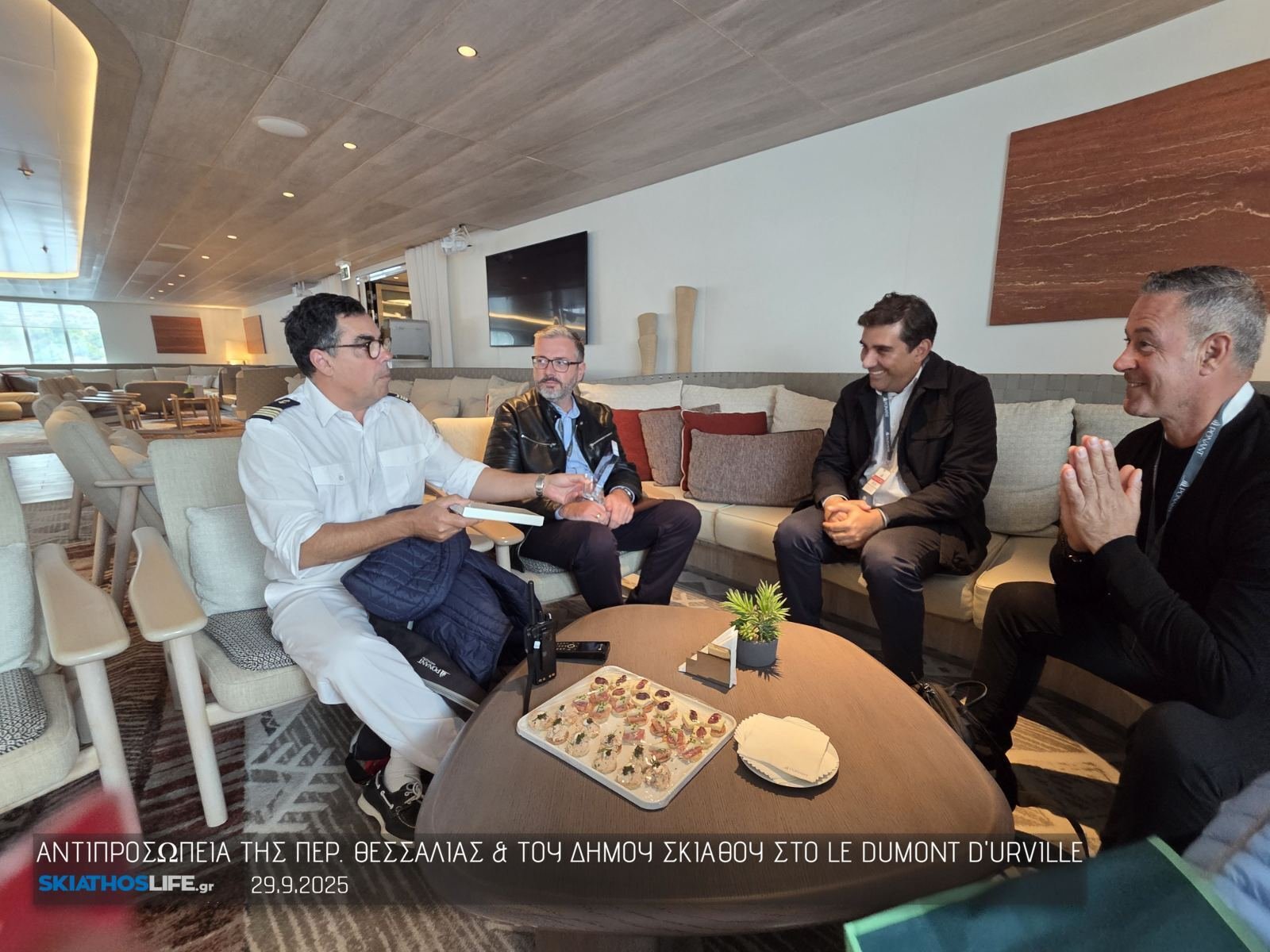 Αντιπροσωπεία της Περιφέρειας Θεσσαλίας με την Εντεταλμένη Περιφερειακή Σύμβουλο Β. Σποράδων κα Αμαλία Γραββάνη και του Δήμου Σκιάθου παρουσία του Δημάρχου Θοδωρή Τζούμα, του Προέδρου του Δημοτικού Λιμενικού Ταμείου κ. Γιώργου Διολέττα βρέθηκαν στο κρουαζιερόπλοιο Le Dumont-d’Urville, όπου είχαν εποικοδομητική συνάντηση με εκπρόσωπο της εταιρίας, τον Πλοίαρχο του πλοίου παρουσία του εκπροσώπου του Πρακτορείου Vanda Travel κ. Σπύρου Μιχούδη.