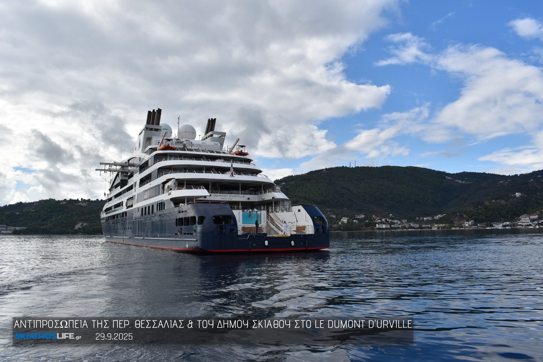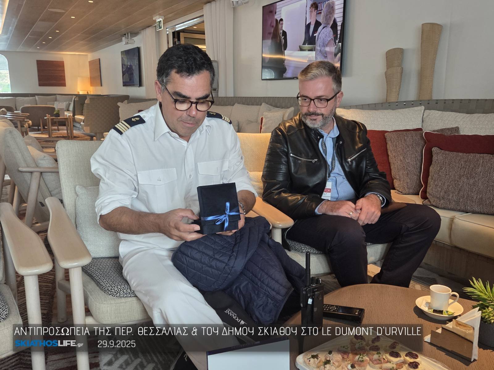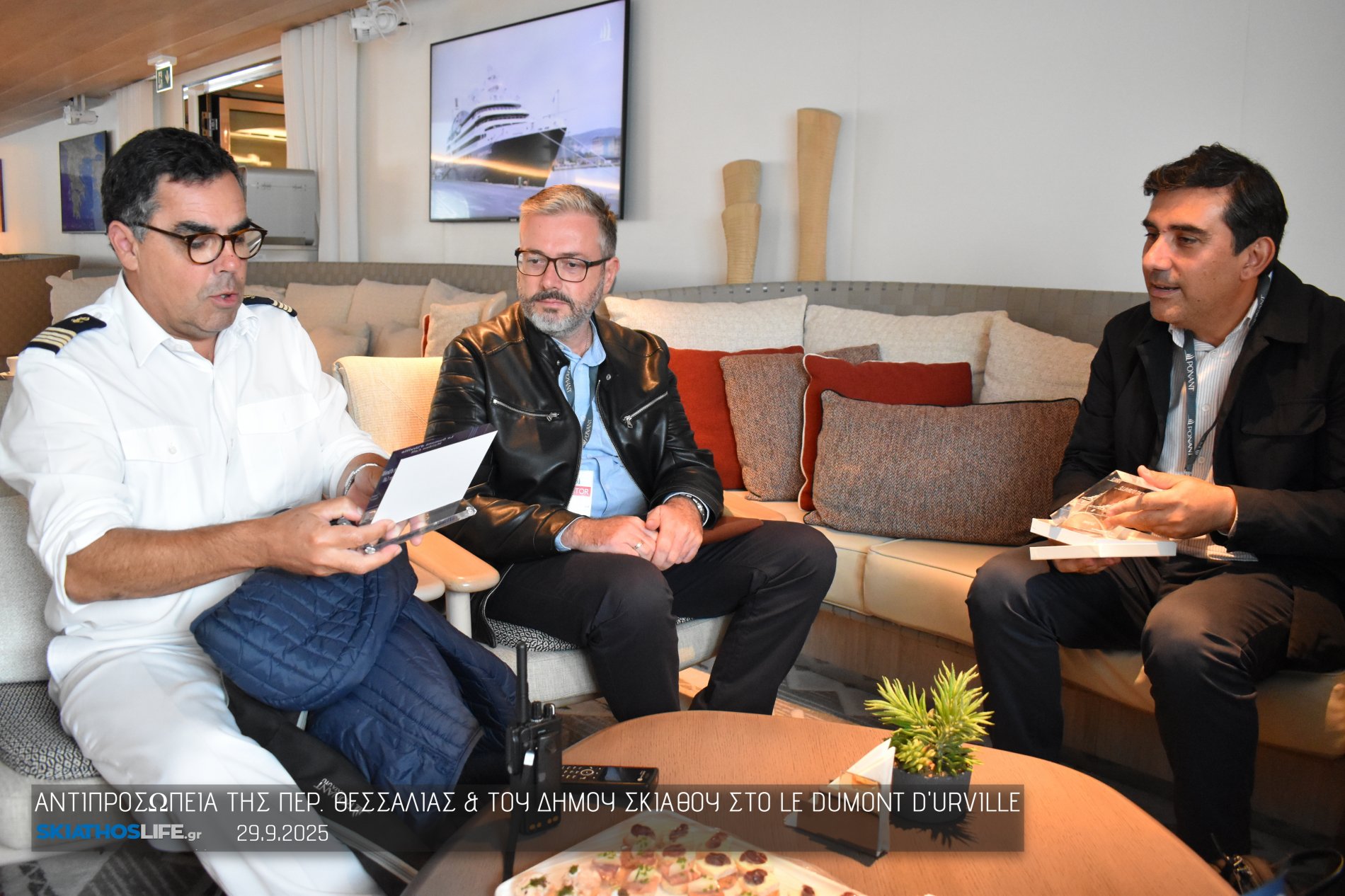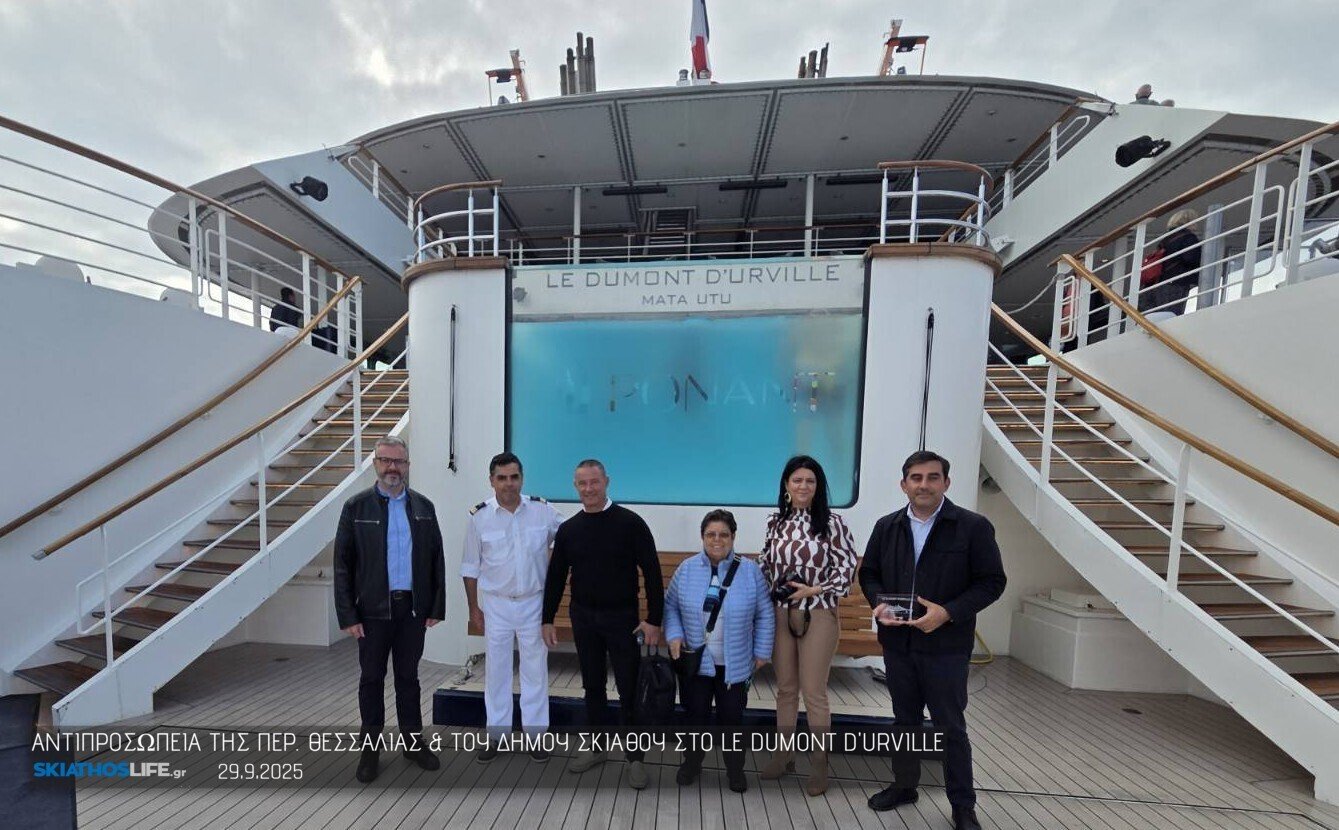 Αντιπροσωπεία της Περιφέρειας Θεσσαλίας με την Εντεταλμένη Περιφερειακή Σύμβουλο Β. Σποράδων κα Αμαλία Γραββάνη και του Δήμου Σκιάθου παρουσία του Δημάρχου Θοδωρή Τζούμα, του Προέδρου του Δημοτικού Λιμενικού Ταμείου κ. Γιώργου Διολέττα βρέθηκαν στο κρουαζιερόπλοιο Le Dumont-d’Urville, όπου είχαν εποικοδομητική συνάντηση με εκπρόσωπο της εταιρίας, τον Πλοίαρχο του πλοίου παρουσία του εκπροσώπου του Πρακτορείου Vanda Travel κ. Σπύρου Μιχούδη.