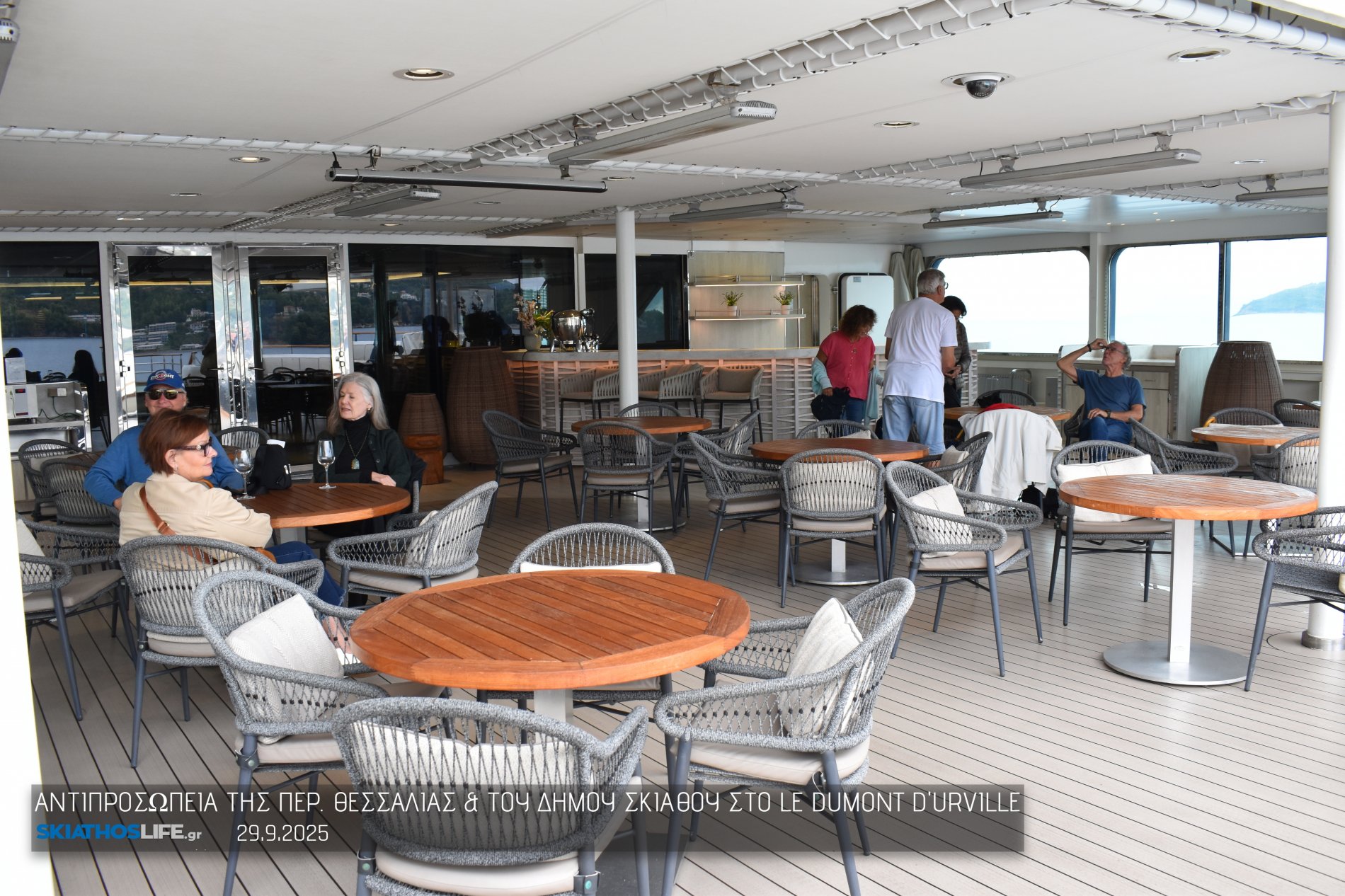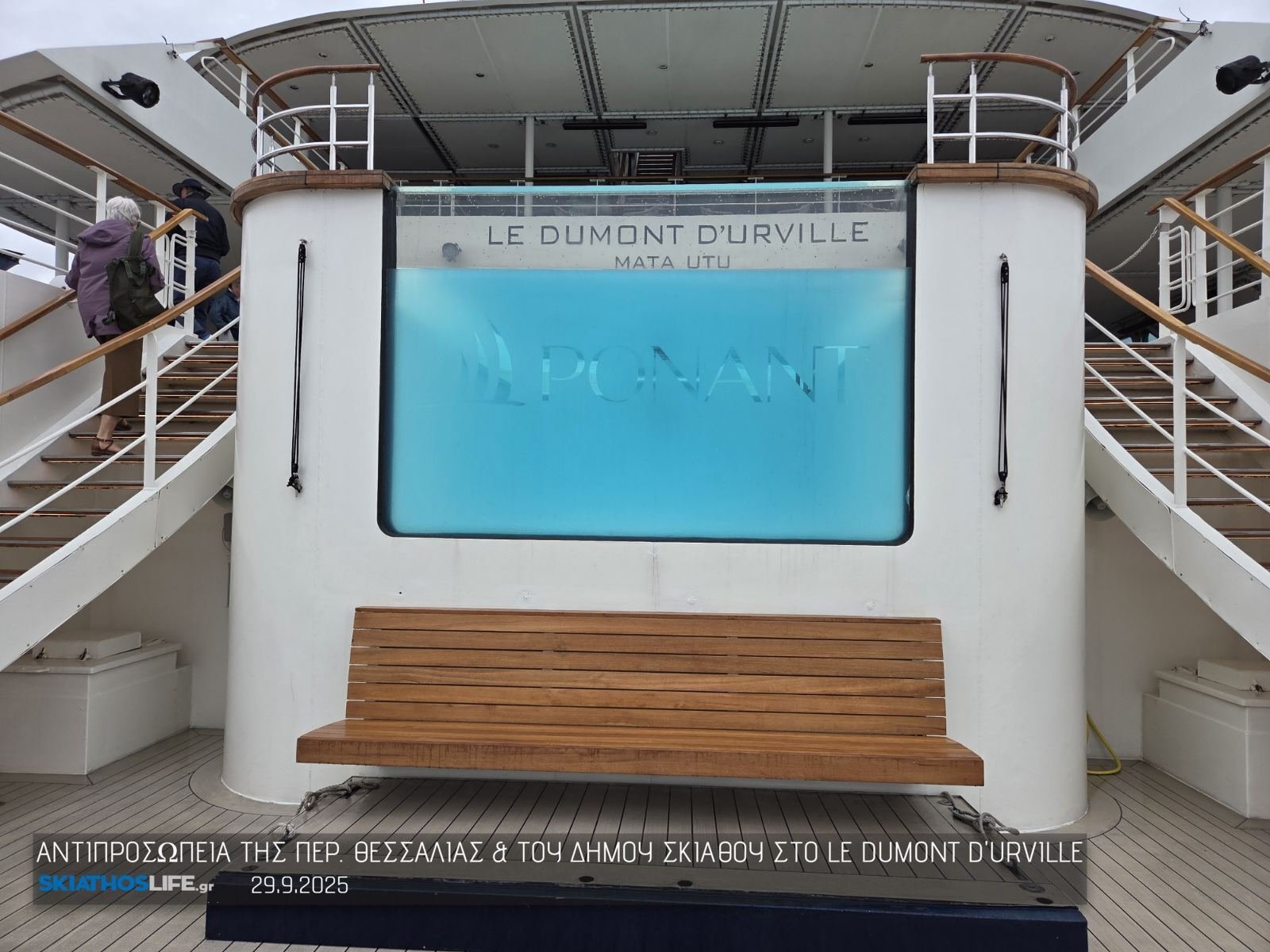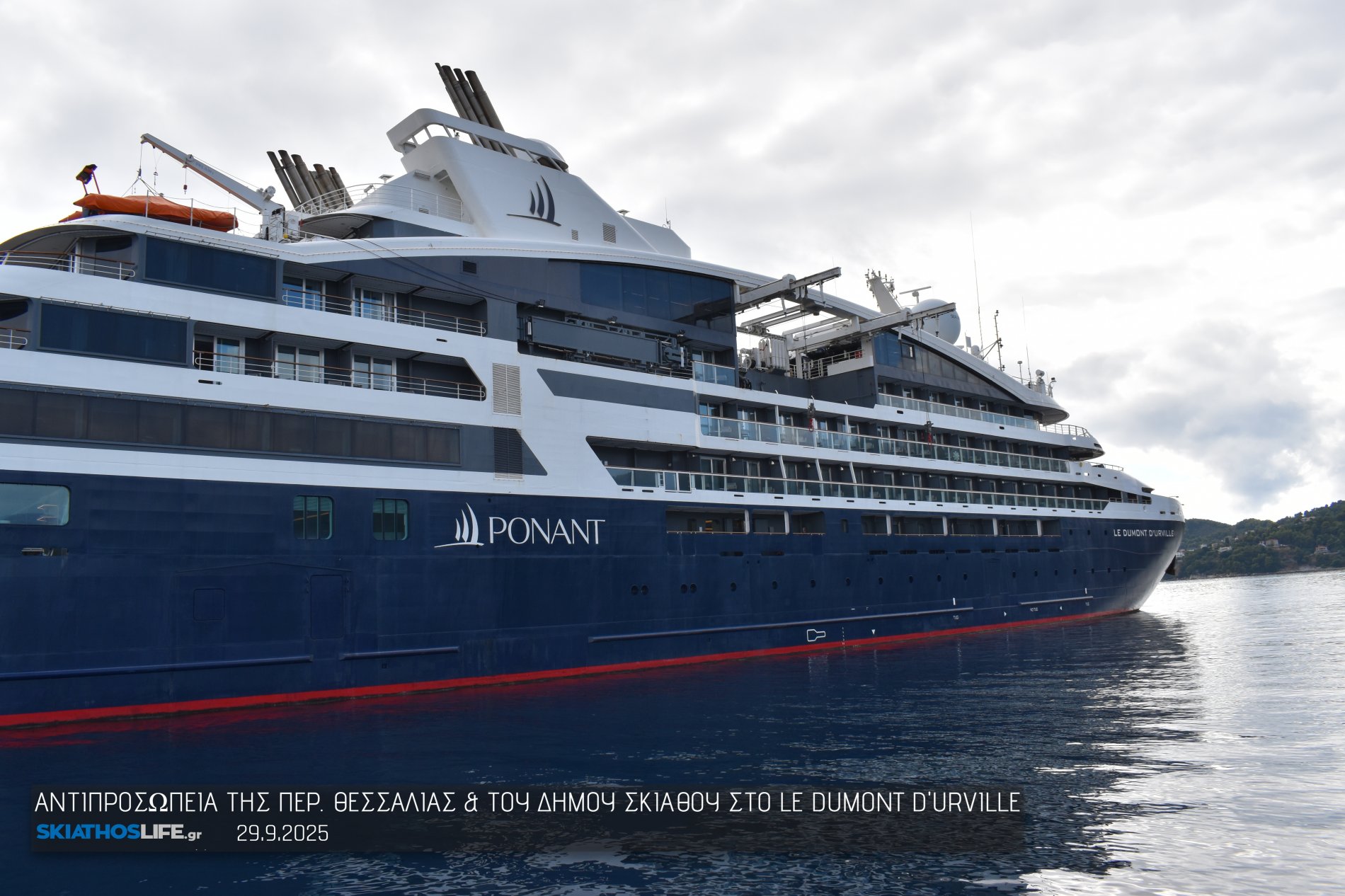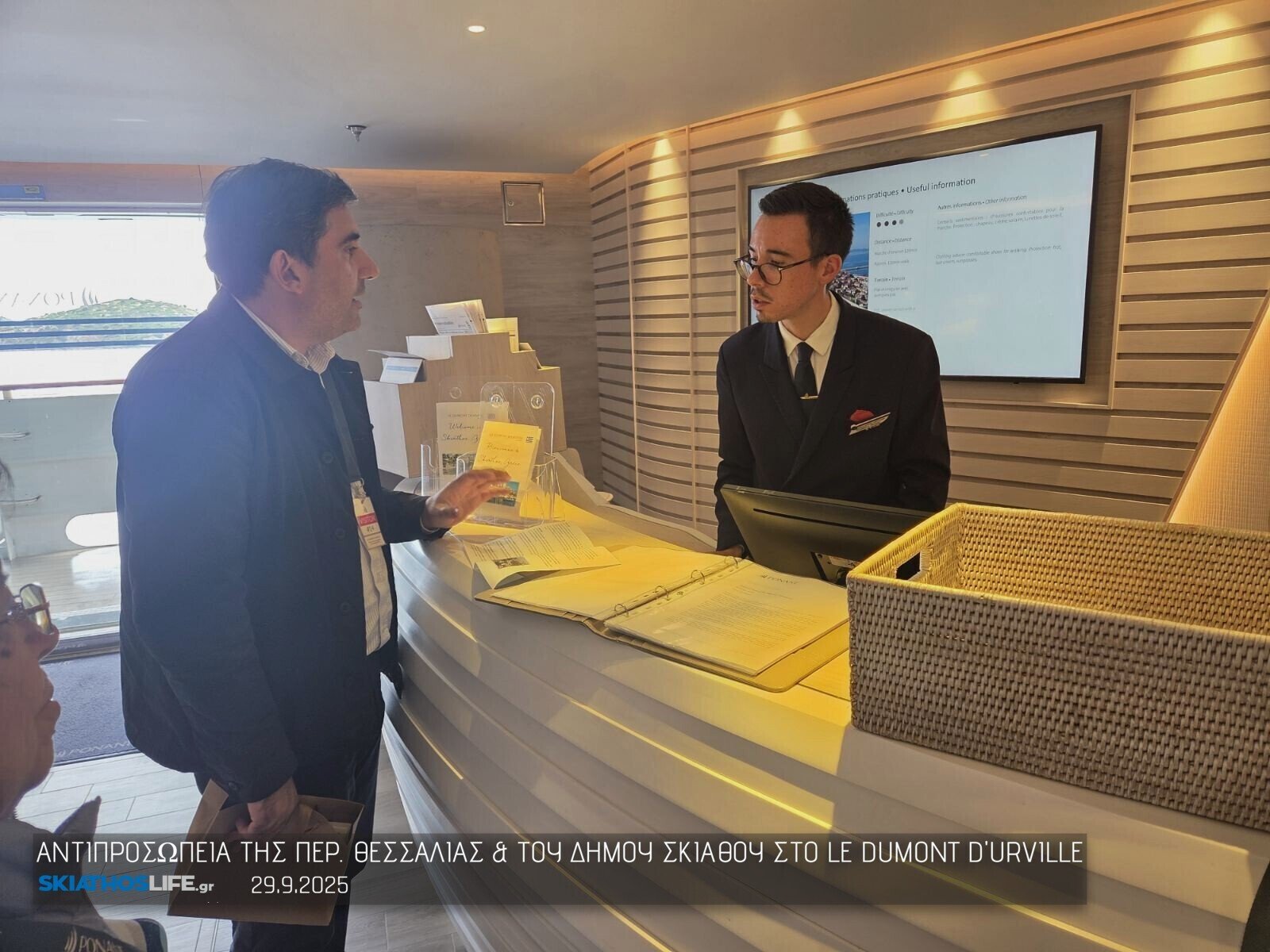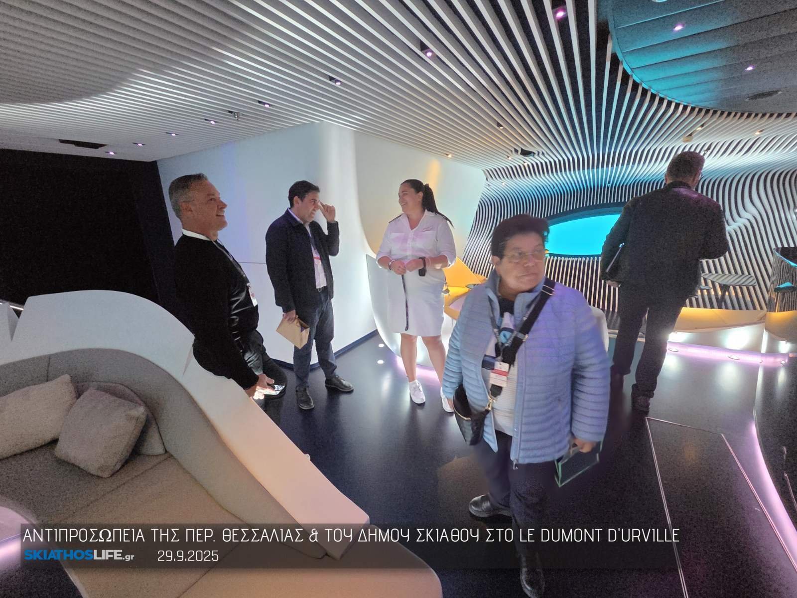 Αντιπροσωπεία της Περιφέρειας Θεσσαλίας με την Εντεταλμένη Περιφερειακή Σύμβουλο Β. Σποράδων κα Αμαλία Γραββάνη και του Δήμου Σκιάθου παρουσία του Δημάρχου Θοδωρή Τζούμα, του Προέδρου του Δημοτικού Λιμενικού Ταμείου κ. Γιώργου Διολέττα βρέθηκαν στο κρουαζιερόπλοιο Le Dumont-d’Urville, όπου είχαν εποικοδομητική συνάντηση με εκπρόσωπο της εταιρίας, τον Πλοίαρχο του πλοίου παρουσία του εκπροσώπου του Πρακτορείου Vanda Travel κ. Σπύρου Μιχούδη.