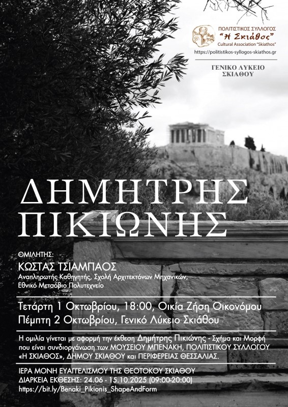 Ο Πολιτιστικός Σύλλογος «Η Σκιάθος» σε συνεργασία με το Μουσείο Μπενάκη, τον Δήμο Σκιάθου και την Περιφέρεια Θεσσαλίας διοργανώνει εκδηλώσεις αφιερωμένες στον σπουδαίο Έλληνα αρχιτέκτονα Δημήτρη Πικιώνη, με αφορμή την έκθεση «Δημήτρης Πικιώνης – Σχήμα και Μορφή».
