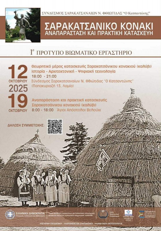 Σύνδεσμος Σαρακατσαναίων Νομού Φθιώτιδας «Ο Κατσαντώνης» καλεί όλα τα μέλη του και φίλους στο 1ο Πρότυπο Βιωματικό Εργαστήριο Κατασκευής Σαρακατσάνικου Κονακιού (καλύβι) με τίτλο «Ζωντανό Κονάκι: Αλληλοεπιδρώντας με το χθες και το σήμερα των Σαρακατσάνων».