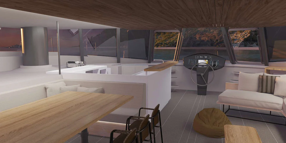 Το εσωτερικό του σκάφους είναι προσεκτικά σχεδιασμένο, με ευρύχωρο σαλόνι που προσφέρει πανοραμική θέα και άνετους καναπέδες, δημιουργώντας μια ατμόσφαιρα γαλήνης και χαλάρωσης. Το πίσω κατάστρωμα (aft cockpit) διαθέτει άφθονο χώρο για εξωτερική διαβίωση, με μεγάλες ξαπλώστρες ιδανικές για να απολαύσετε τον μεσογειακό ήλιο. Με μερικό κλιματισμό και μοντέρνες ανέσεις, το GANANY συνδυάζει άψογα την άνεση με τη βιωσιμότητα.