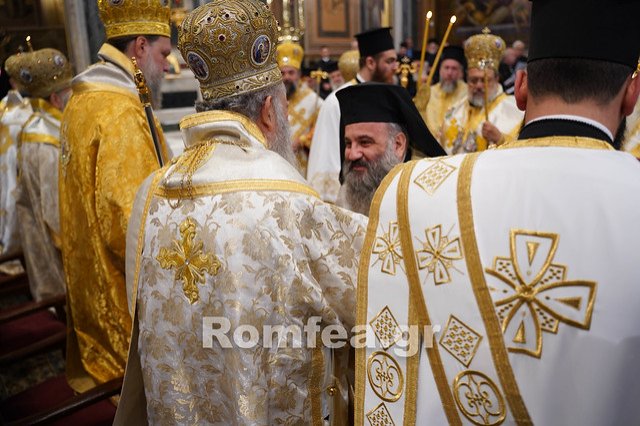 Με τον Αρχιεπίσκοπο συλλειτουργούν οι Μητροπολίτες Δημητριάδος Ιγνάτιος, Χαλκίδος Χρυσόστομος, Μεσσηνίας Χρυσόστομος, Νέας Ιωνίας Γαβριήλ, Ιερισσού Θεόκλητος, Θεσσαλιώτιδος Τιμόθεος, Θήρας Αμφιλόχιος, Γόρτυνος Νικηφόρος, Παραμυθίας Σεραπίων και ο Επίσκοπος Σκοπέλου Νικόδημος.