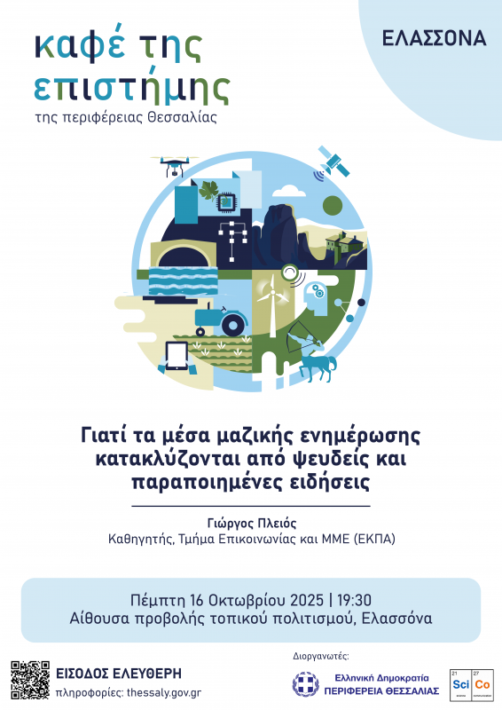 Η Περιφέρεια Θεσσαλίας, σε συνεργασία με τον εκπαιδευτικό μη κερδοσκοπικό οργανισμό «SciCo - Επιστήμη Επικοινωνία», εγκαινιάζει το «Καφέ της Επιστήμης της Περιφέρειας Θεσσαλίας», μια σειρά ανοιχτών εκδηλώσεων που φέρνουν την επιστήμη πιο κοντά στους πολίτες. Από τον Οκτώβριο έως τον Δεκέμβριο θα πραγματοποιηθούν 13 συναντήσεις σε 10 πόλεις και κωμοπόλεις της Θεσσαλίας (Καρδίτσα, Παλαμάς, Λάρισα, Τύρναβος, Ελασσόνα, Βόλος, Αλμυρός, Σκιάθος, Τρίκαλα, Καλαμπάκα).