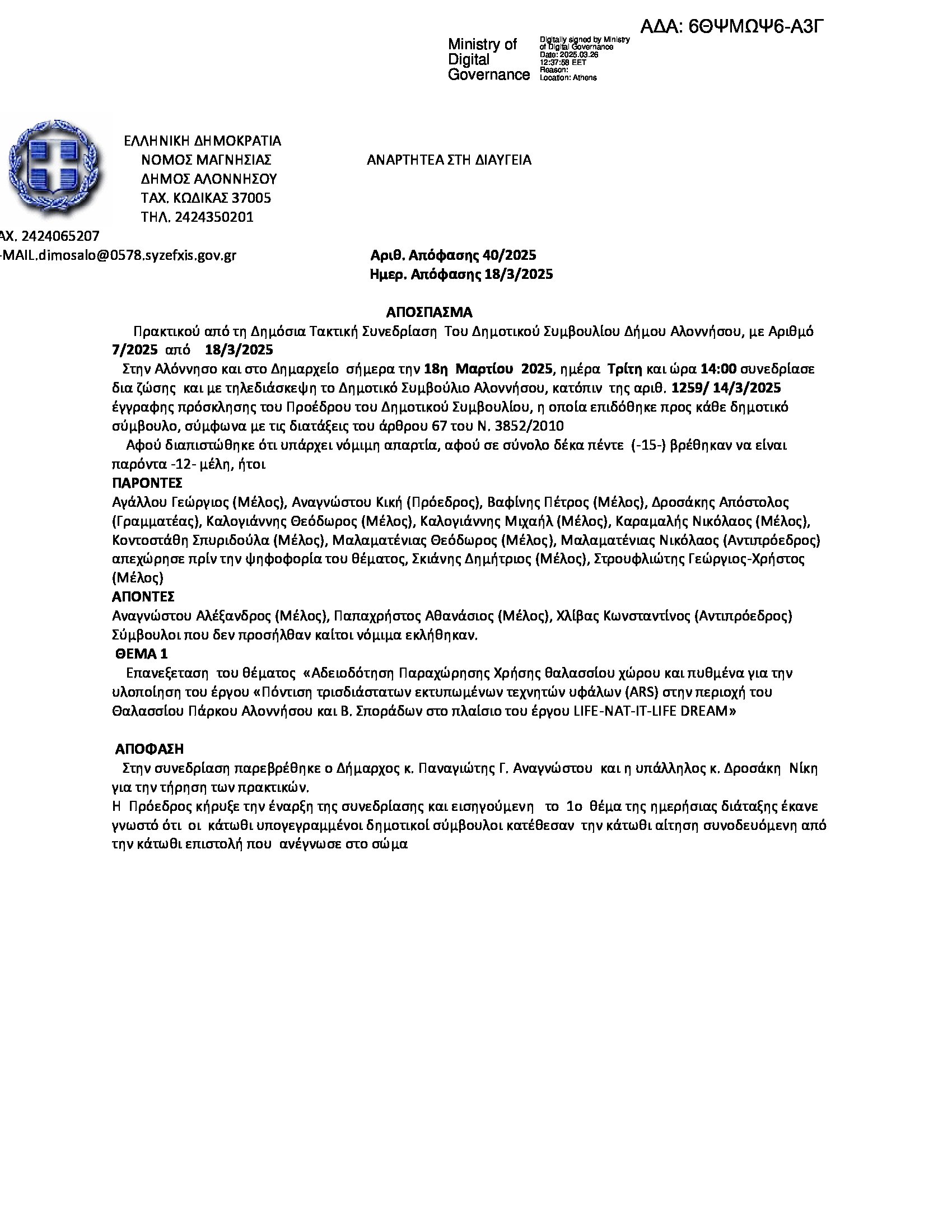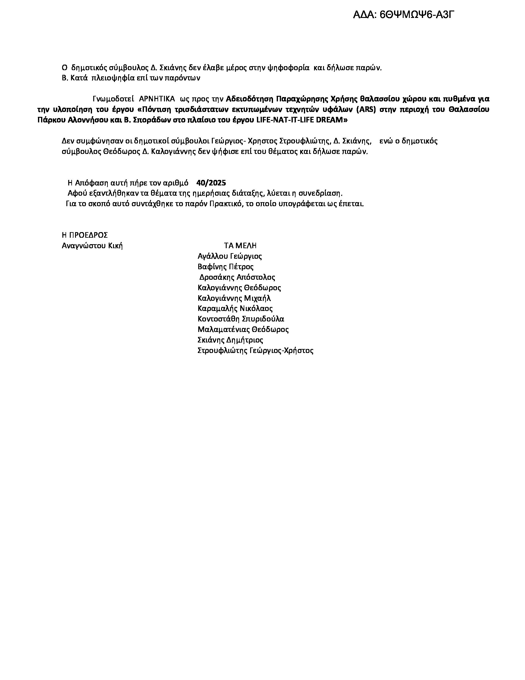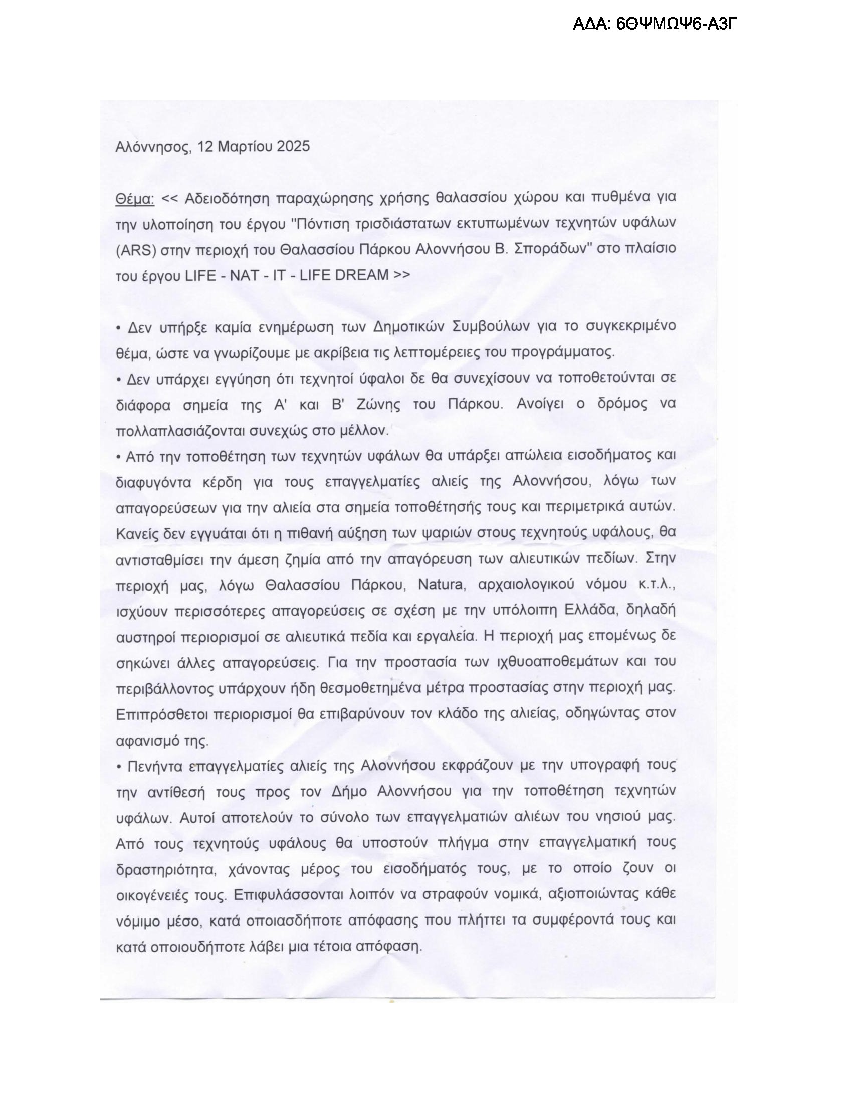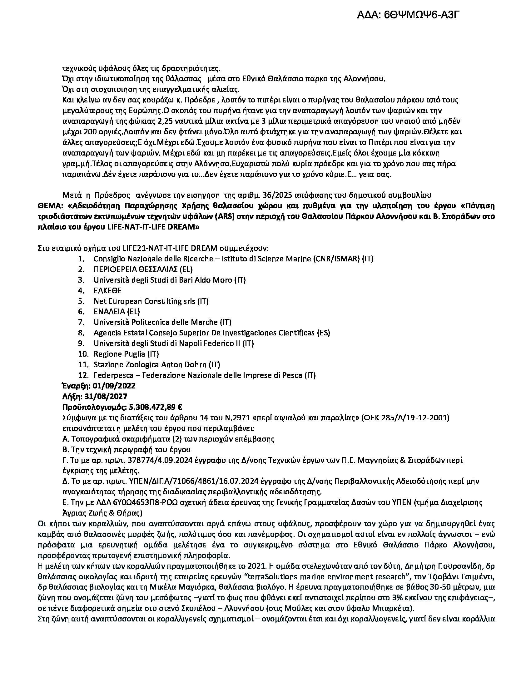 Στις 26 Μαρτίου 2025, το Δημοτικό Συμβούλιο Αλοννήσου εξέτασε εκ νέου το θέμα της παραχώρησης θαλάσσιου χώρου και πυθμένα για το έργο «Πόντιση τρισδιάστατων εκτυπωμένων τεχνητών υφάλων (ARS)» στο πλαίσιο του προγράμματος LIFE-NAT-IT-LIFE DREAM, εντός του Θαλασσίου Πάρκου Αλοννήσου – Βορείων Σποράδων.
