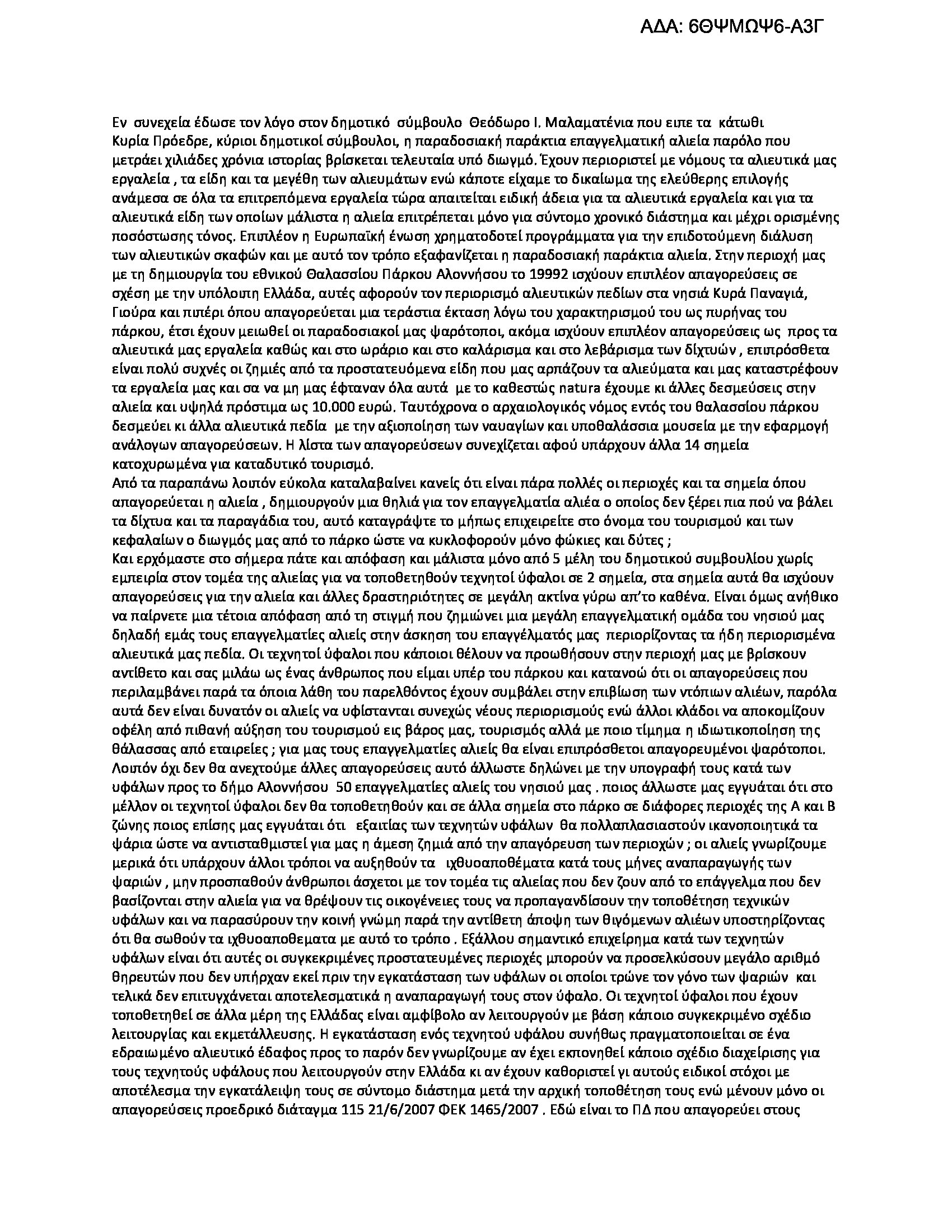 το Δημοτικό Συμβούλιο γνωμοδότησε αρνητικά στην παραχώρηση του θαλάσσιου χώρου και πυθμένα για την πόντιση των τεχνητών υφάλων.