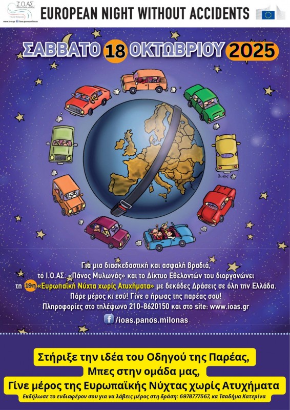 Ο Δήμος Λαμιέων συμμετέχει και φέτος ενεργά στην «Ευρωπαϊκή Νύχτα χωρίς Ατυχήματα» του «Ι.Ο.ΑΣ. Πάνος Μυλωνάς», σε συνεργασία με το Τμήμα Τροχαίας Λαμίας.