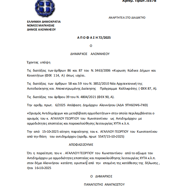 H απόφαση παραίτησης του κ. Αγάλλου Γεώργιου