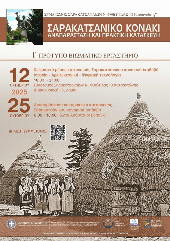 Λόγω έντονων καιρικών συνθηκών το πρακτικό (βιωματικό) μέρος του 1ου Πρότυπου Βιωματικού Εργαστηρίου Κατασκευής Σαρακατσάνικου Κονακιού (καλύβι), με θέμα «Ζωντανό Κονάκι: Αλληλεπιδρώντας με το χθες και το σήμερα των Σαρακατσάνων»θα πραγματοποιηθεί την Σάββατο 25 Οκτωβρίου 2025, στους Αγίους Αποστόλους – Βελούχι, από τις 08:00 έως 18:00, όπου θα γίνει αναπαράσταση και πρακτική κατασκευή σαρακατσάνικου κονακιού.