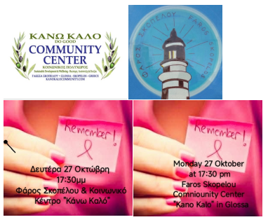 Ο Φάρος Σκοπέλου και το Κοινωνικό Κέντρο "Κάνω Καλό" διοργανώνουν, στα πλαίσια του Οκτώβρη μήνα πρόληψης και ευαισθητοποίησης για το Καρκίνο του μαστού, εκδήλωση με θέμα "ΠΡΟΛΗΨΗ...μείνε ασφαλης`