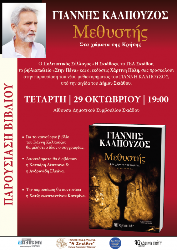 Η Σκιάθος φιλοξενεί απόψε έναν από τους σημαντικότερους εκπροσώπους της σύγχρονης ελληνικής λογοτεχνίας, τον Γιάννη Καλπούζο, με αφορμή την παρουσίαση του νέου του μυθιστορήματος «Μεθυστής – Στα χώματα της Κρήτης», που κυκλοφορεί από τις εκδόσεις Χάρτινη Πόλη.