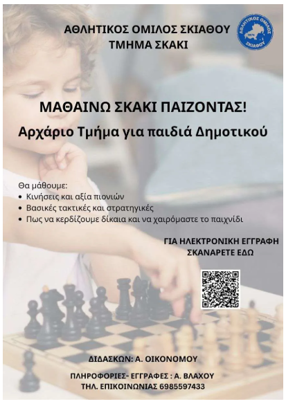 Ο Αθλητικός Όμιλος Σκιάθου ανοίγει τις πόρτες του σε μικρούς φίλους του σκακιού με ένα νέο Αρχάριο Τμήμα για παιδιά Δημοτικού. Μέσα από το πρόγραμμα «Μαθαίνω Σκάκι Παίζοντας», τα παιδιά θα εξοικειωθούν με το δημοφιλές πνευματικό άθλημα μέσα από δημιουργική και ευχάριστη μάθηση.