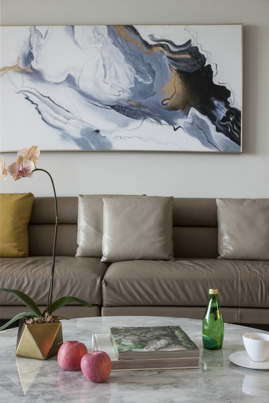 - Επιλέξτε ένα μεγάλο αφαιρετικό έργο σε ουδέτερη παλέτα και αφήστε τον τοίχο να αναπνεύσει γύρω του.