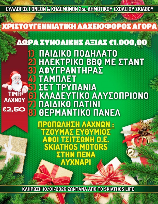Ο Σύλλογος Γονέων και Κηδεμόνων του 2ου Δημοτικού Σχολείου Σκιάθου μπαίνει σε γιορτινούς ρυθμούς και διοργανώνει Χριστουγεννιάτικη λαχειοφόρο αγορά με σκοπό την κάλυψη των αναγκών του σχολείου !!!