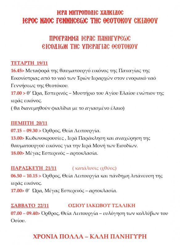 Η Ιερά Μητρόπολις Χαλκίδος και ο Ιερός Ναός Γεννήσεως της Θεοτόκου Σκιάθου ανακοινώνουν με χαρά και πνευματική αγαλλίαση το πρόγραμμα της Ιεράς Πανηγύρεως των Εισοδίων της Υπεραγίας Θεοτόκου, μιας από τις λαμπρότερες και σεπτότερες εορτές της Ορθοδοξίας.