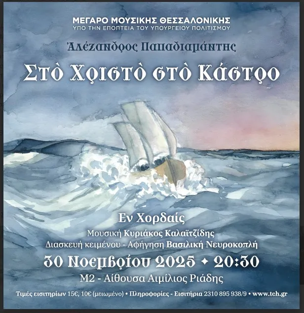 Η μουσική παράσταση Στο Χριστό στο Κάστρο βασίζεται στο ομώνυμο διήγημα του Αλέξανδρου Παπαδιαμάντη. Μετά τη θερμή του υποδοχή και τη μεγάλη επιτυχία της πρεμιέρας στη Βοστώνη, η παράσταση παρουσιάζεται στη Θεσσαλονίκη. Η Βασιλική Νευροκοπλή διασκεύασε μια συνεπτυγμένη μορφή του διηγήματος σε ιαμβικό δεκαπεντασύλλαβο με ομοιοκαταληξία, αποδίδοντας με πιστότητα το ύφος και τη γλώσσα του Παπαδιαμάντη. Ο Κυριάκος Καλαϊτζίδης συνέθεσε πρωτότυπη μουσική και μελοποίησε τους στοίχους, αξιοποιώντας τα ηχοχρώματα και τις μελωδίες της βυζαντινής οκταηχίας. Πρόκειται για μια ιδιαίτερη μουσική παράσταση για μικρούς και μεγάλους, που μας ταξιδεύει στη Σκιάθο του 18ου αιώνα και αναδεικνύει με ευαισθησία την πίστη, την απλότητα και την αλληλεγγύη των απλών ανθρώπων, ενώ αποτυπώνει με γλαφυρότητα το ελληνικό ήθος και το ορθόδοξο πνεύμα της εορτής των Χριστουγέννων.