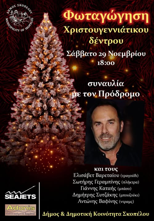 Ο Δήμος Σκοπέλου και η Δημοτική Κοινότητα ανακοινώνουν με χαρά την επίσημη Φωταγώγηση του Χριστουγεννιάτικου Δέντρου, η οποία θα πραγματοποιηθεί το Σάββατο 29 Νοεμβρίου, στις 18:00.
