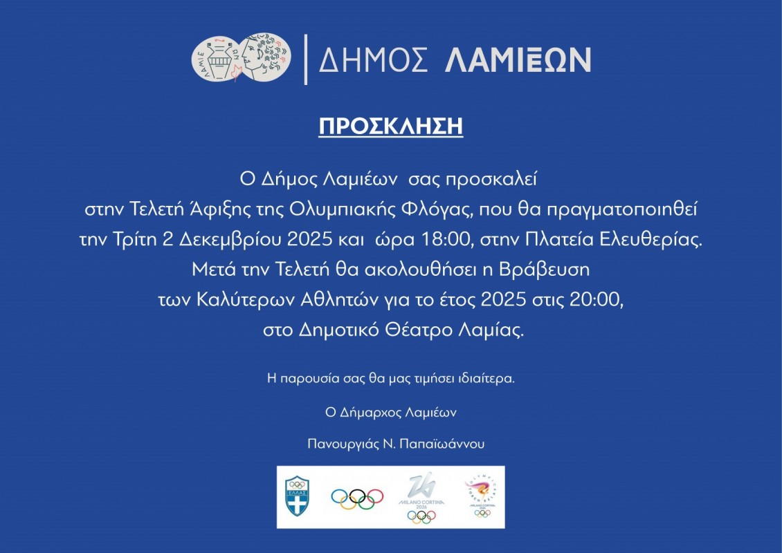 Στο πλαίσιο της διεθνούς Λαμπαδηδρομίας για τους Χειμερινούς Ολυμπιακούς Αγώνες Μιλάνο - Κορτίνα 2026, ο Δήμος Λαμιέων ανακοινώνει ένα τριήμερο εορταστικών και εκπαιδευτικών δράσεων, με αφορμή την άφιξη της Ολυμπιακής Φλόγας που θα φωτίσει την πόλη μας την Τρίτη 2 Δεκεμβρίου 2025.