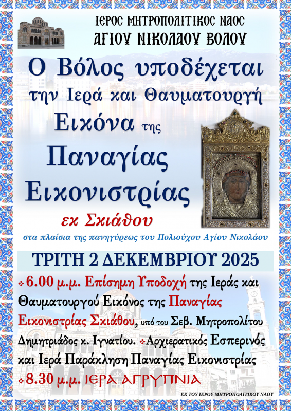 Η Ιερά Εικόνα θα αφιχθεί εν πλω στο Λιμάνι του Βόλου την Τρίτη 2 Δεκεμβρίου 2025, και θα την συνοδεύουν ο Πρωτ. Γεώργιος Σταματάς, Προϊστάμενος του Ιερού Ναού Αγίων Τριών Ιεραρχών Σκιάθου και ο Δήμαρχος της Σκιάθου κ. Θεόδωρος Τζούμας. Η επίσημη υποδοχή της θα γίνει στον Μητροπολιτικό Ναό του Βόλου στις 6μ.μ. από τον Σεβ. Μητροπολίτη Δημητριάδος κ. Ιγνάτιο, επικεφαλής του ιερού Κλήρου και του ευσεβούς λαού.
