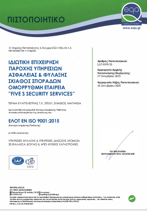 Με συνέπεια, επαγγελματισμό και απόλυτη προσήλωση στην ποιότητα, η FIVE S Security Services έχει αναπτύξει και εφαρμόζει πιστοποιημένο Σύστημα Διαχείρισης Ποιότητας, σύμφωνα με το διεθνές πρότυπο ΕΛΟΤ ΕΝ ISO 9001:2015.