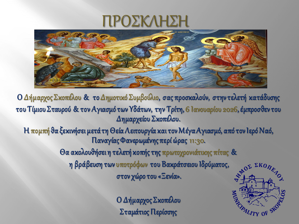 Ο Δήμαρχος Σκοπέλου & το Δημοτικό Συμβούλιο, σας προσκαλούν, στην τελετή κατάδυσης του Τίμιου Σταυρού & τον Αγιασμό των Υδάτων, την Τρίτη, 6 Ιανουαρίου 2026, έμπροσθεν του Δημαρχείου Σκοπέλου.