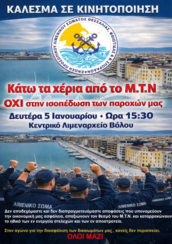 Σας καλούμε να παρευρεθείτε στην συγκέντρωση διαμαρτυρίας των Λιμενικών που θα πραγματοποιηθούν την Δευτέρα 05 Ιανουαρίου 2026 σε όλη την Ελλάδα. Για την περιοχή της Μαγνησίας, η διαμαρτυρία θα λάβει χώρα την Δευτέρα 05 Ιανουαρίου και ώρα 15:30 έξωθεν του Κεντρικού Λιμεναρχείου Βόλου.