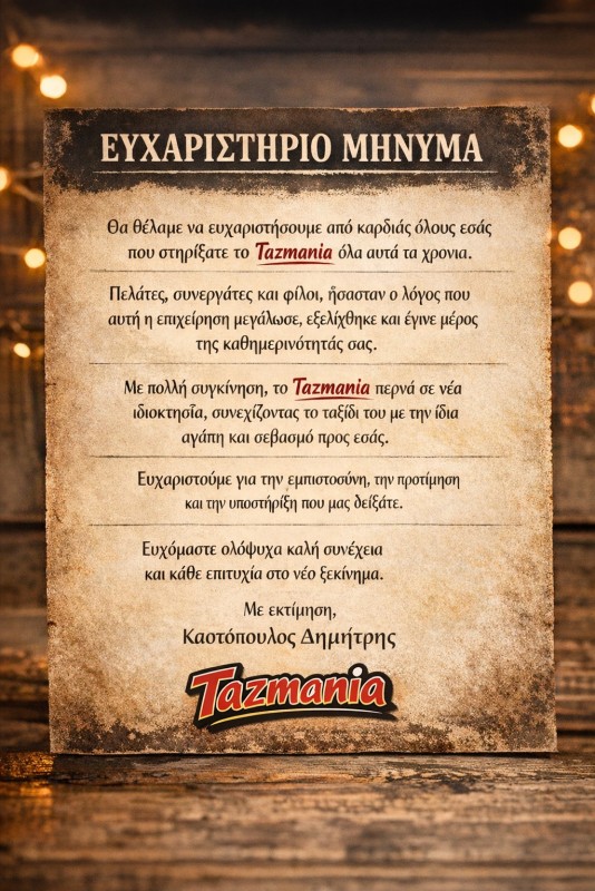 Από 1η Φεβρουαρίου 2026, τη διαχείριση του TAZMANIA αναλαμβάνει ένας νέος άνθρωπος, ο Ηλίας Νοφούλας, με όραμα, φρέσκες ιδέες και σεβασμό στην ιστορία του χώρου. Η αλλαγή αυτή σηματοδοτεί ένα νέο ξεκίνημα, με στόχο να διατηρηθεί ο χαρακτήρας που όλοι αγαπήσαμε, εμπλουτισμένος με νέα στοιχεία και προοπτική.