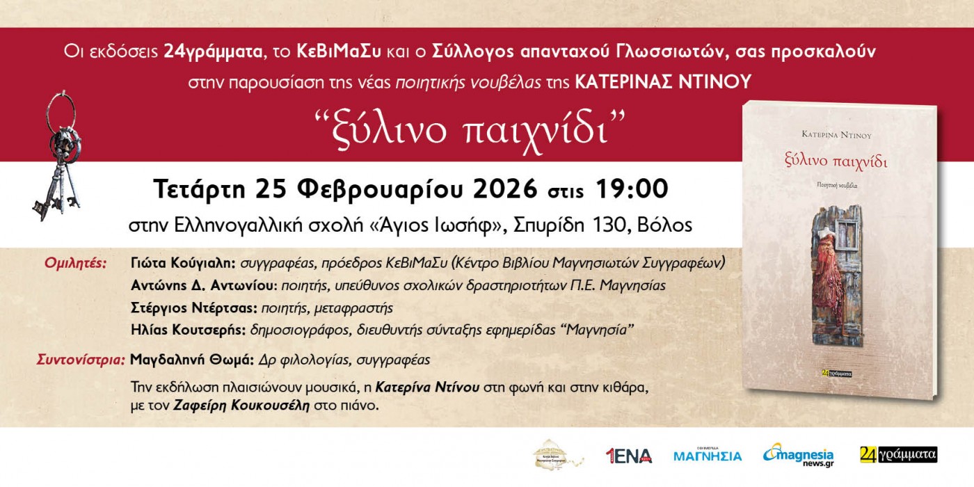 Τα 24γράμματα, το ΚεΒιΜαΣυ και ο Σύλλογος Απανταχού Γλωσσιωτών, σας προσκαλούν στην πρώτη παρουσίαση της ποιητικής νουβέλας «ξύλινο παιχνίδι» της Κατερίνας Ντίνου, που θα πραγματοποιηθεί στον Βόλο, την Τετάρτη 25 Φεβρουαρίου 2026, στις 19:00, στο αμφιθέατρο της Ελληνογαλλικής Σχολής «Άγιος Ιωσήφ» (Σπυρίδη 130, Βόλος).