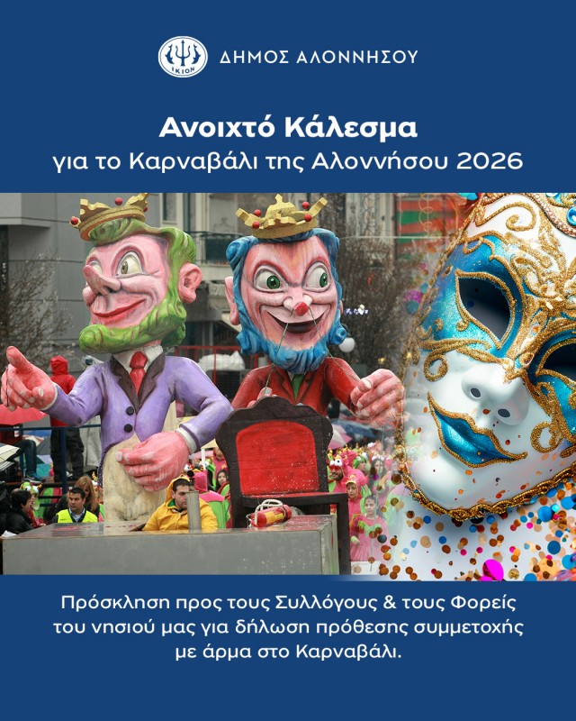 Σε συνέχεια της συνάντησης του Αντιδημάρχου Πολιτισμού, κ. Αλέξανδρου Αναγνώστου, με Συλλόγους και Φορείς του νησιού, ενημερώνουμε ότι οι ομάδες που επιθυμούν να συμμετέχουν με άρμα στο Καρναβάλι 2026 μπορούν να απευθύνονται στο Γραφείο Πολιτισμού του Δήμος Αλοννήσου.