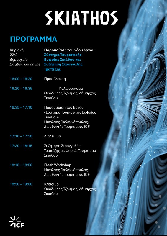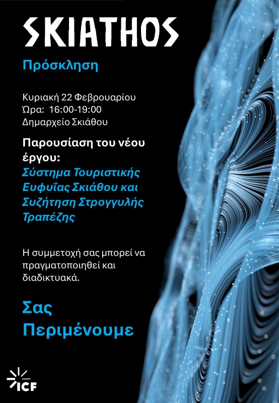 Με ιδιαίτερη χαρά σας προσκαλούμε στην παρουσίαση του νέου έργου «Σύστημα Τουριστικής Ευφυΐας Σκιάθου», μιας πρωτοβουλίας του Δήμου Σκιάθου με την υποστήριξη της ICF, που στοχεύει στην ενίσχυση του στρατηγικού σχεδιασμού και της τεκμηριωμένης λήψης αποφάσεων στον τουρισμό, μέσα από τη συλλογή, ανάλυση και σύνθεση αξιόπιστων δεδομένων.