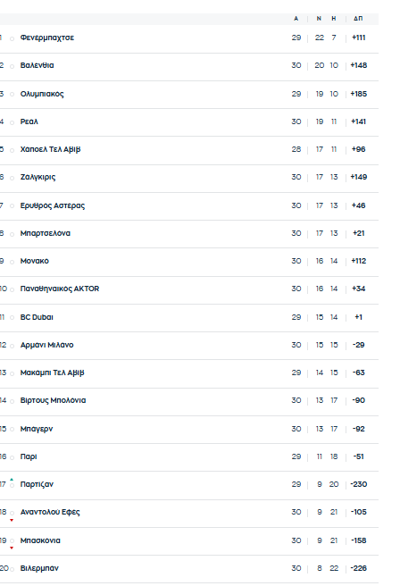 Στο 19-10 ανέβηκε η ομάδα του Γιώργου Μπαρτζώκα (12-3 εντός και 7-7 εκτός έδρας), που έπαιξε χωρίς τον Τόμας Γουόκαπ, τον Μόντε Μόρις και τον Σάσα Βεζένκοβ.