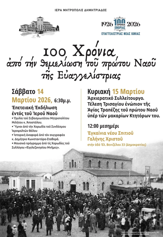 Το διήμερο 14-15/3 η προσφυγική ενορία Ευαγγελιστρίας Νέας Ιωνίας πρόκειται να εορτάσει τα 100 χρόνια από την θεμελίωση του πρώτου Ναού (14/3/1926), που έκτισαν με τα χέρια τους οι Μικρασιάτες πρόσφυγες, μετά την βίαιη απομάκρυνσή τους από τις πατρογονικές τους εστίες και την εγκατάστασή τους στην Μαγνησία.