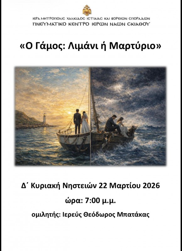 Την Δ’ Κυριακή των Νηστειών 22 Μαρτίου 2026 και ώρα 7:00μ.μ. στο Πνευματικό Κέντρο Ιερών Ναών Σκιάθου θα πραγματοποιηθεί ομιλία από τον πατέρα Θεόδωρο Μπατάκα με θέμα: «Ο ΓΑΜΟΣ: ΛΙΜΑΝΙ ή ΜΑΡΤΥΡΙΟ;»