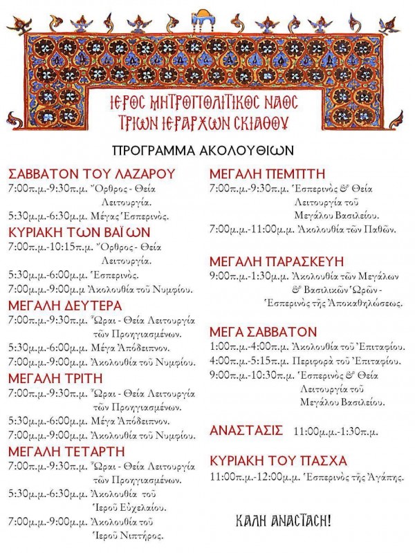 Ο Ιερός Μητροπολιτικός Ναός Τριών Ιεραρχών Σκιάθου ανακοινώνει το πρόγραμμα των Ιερών Ακολουθιών για την περίοδο του Λαζάρου, της Μεγάλης Εβδομάδας και της Αναστάσεως.