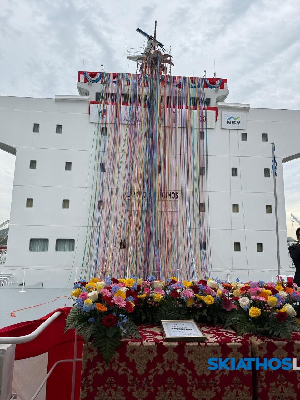 Με ιδιαίτερη χαρά και συγκίνηση, εκφράζουμε τις θερμότερες ευχαριστίες μας προς τον κ. Νικόλαο Θάνο Επιφανιάδη και την ναυτιλιακή εταιρεία Langlois Enterprises Ltd., για την τιμή να δοθεί στο νεότευκτο φορτηγό πλοίο μεταφοράς ξηρού φορτίου, το όνομα “LANGLOIS SKIATHOS”, προβάλλοντας το νησί της Σκιάθου σε ολόκληρο τον κόσμο.