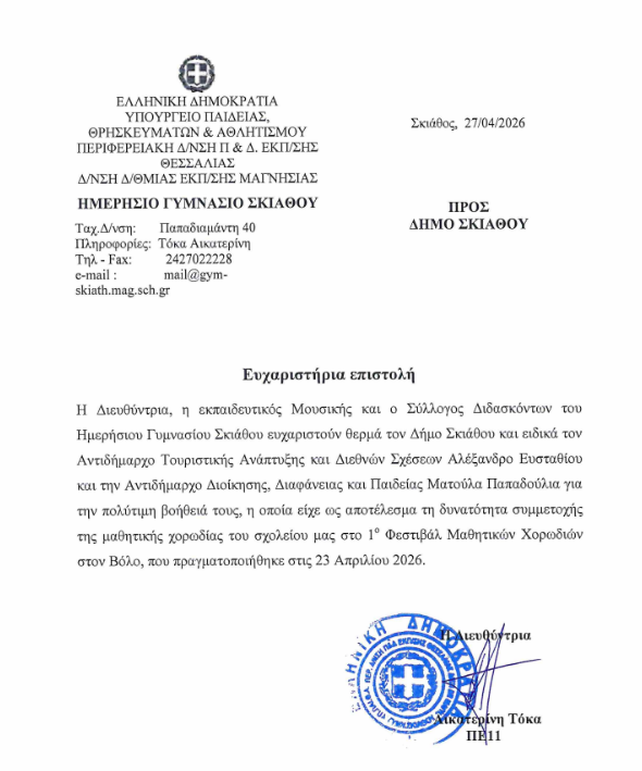 Ευχαριστίες του Ημερήσιου Γυμνασίου Σκιάθου προς τον Δήμο Σκιάθου για τη στήριξη της μαθητικής χορωδίας