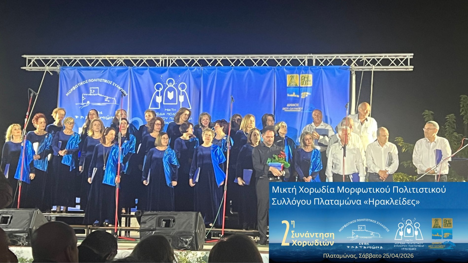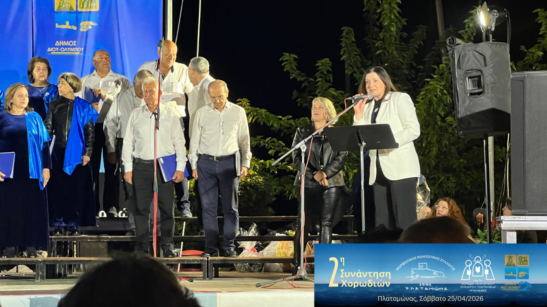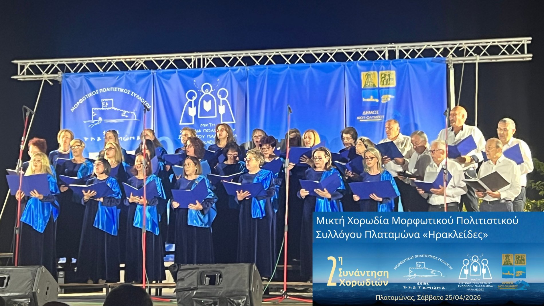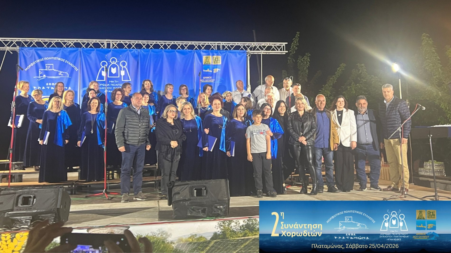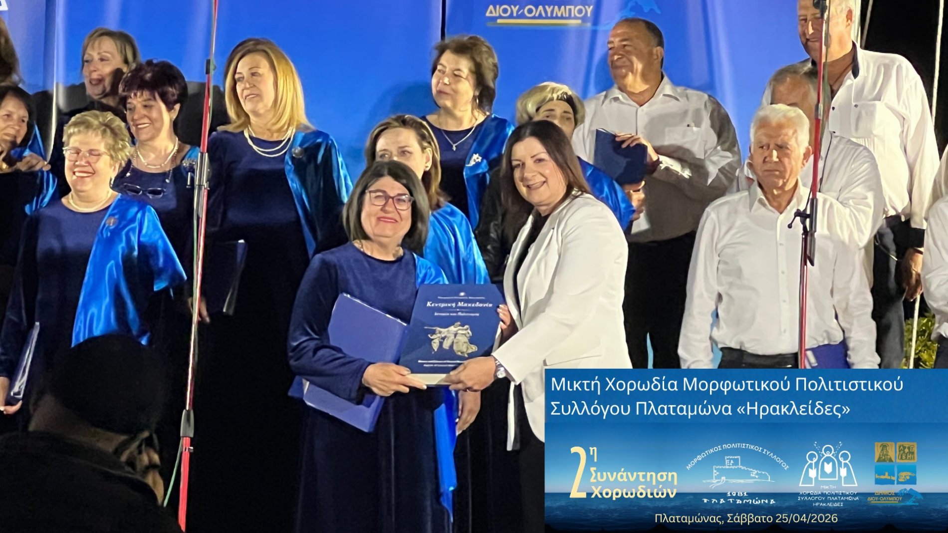 Εντυπωσίασαν το κοινό οι ερμηνείες των έξι χορωδιών που συμμετείχαν στη 2η Συνάντηση Χορωδιών Πλαταμώνα, η οποία διοργανώθηκε το Σάββατο 25 Απριλίου 2026, από τον Μορφωτικό Πολιτιστικό Σύλλογο Πλαταμώνα, τη Μικτή Χορωδία του Πολιτιστικού Συλλόγου Πλαταμώνα «Ηρακλείδες» και τον Δήμο Δίου-Ολύμπου.