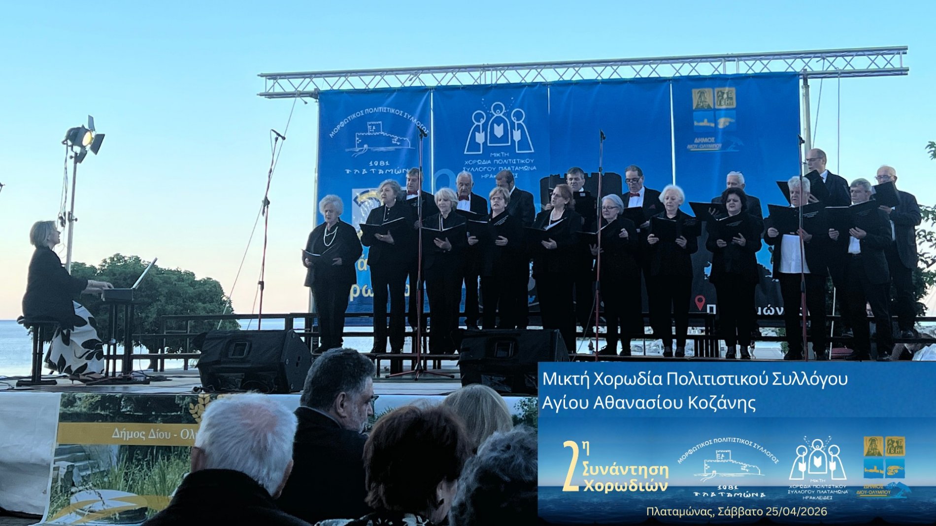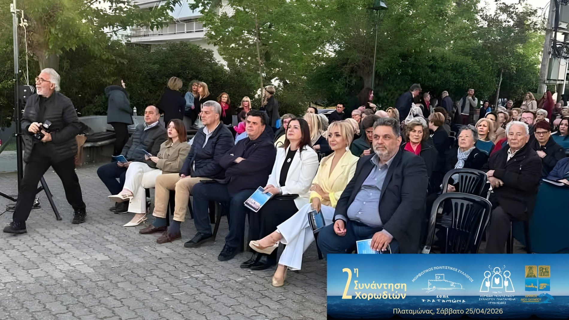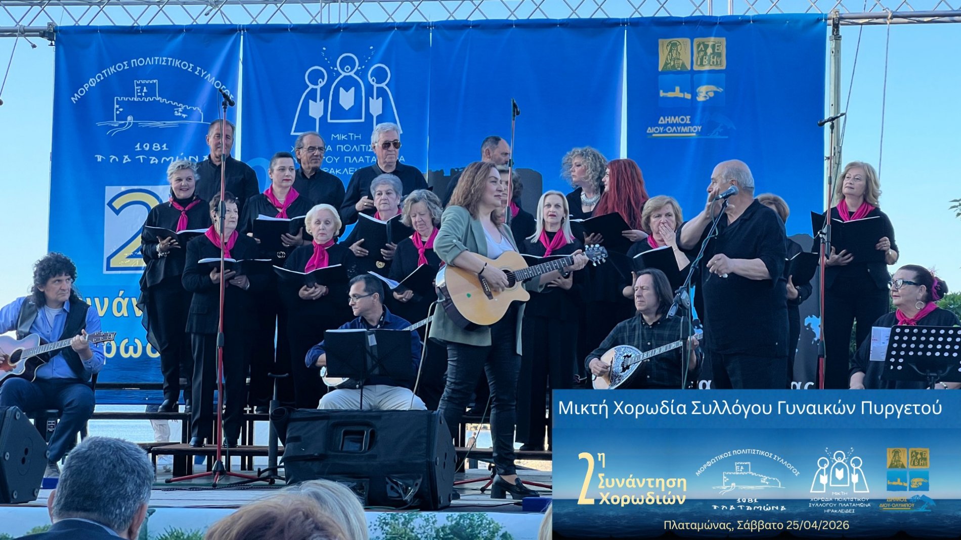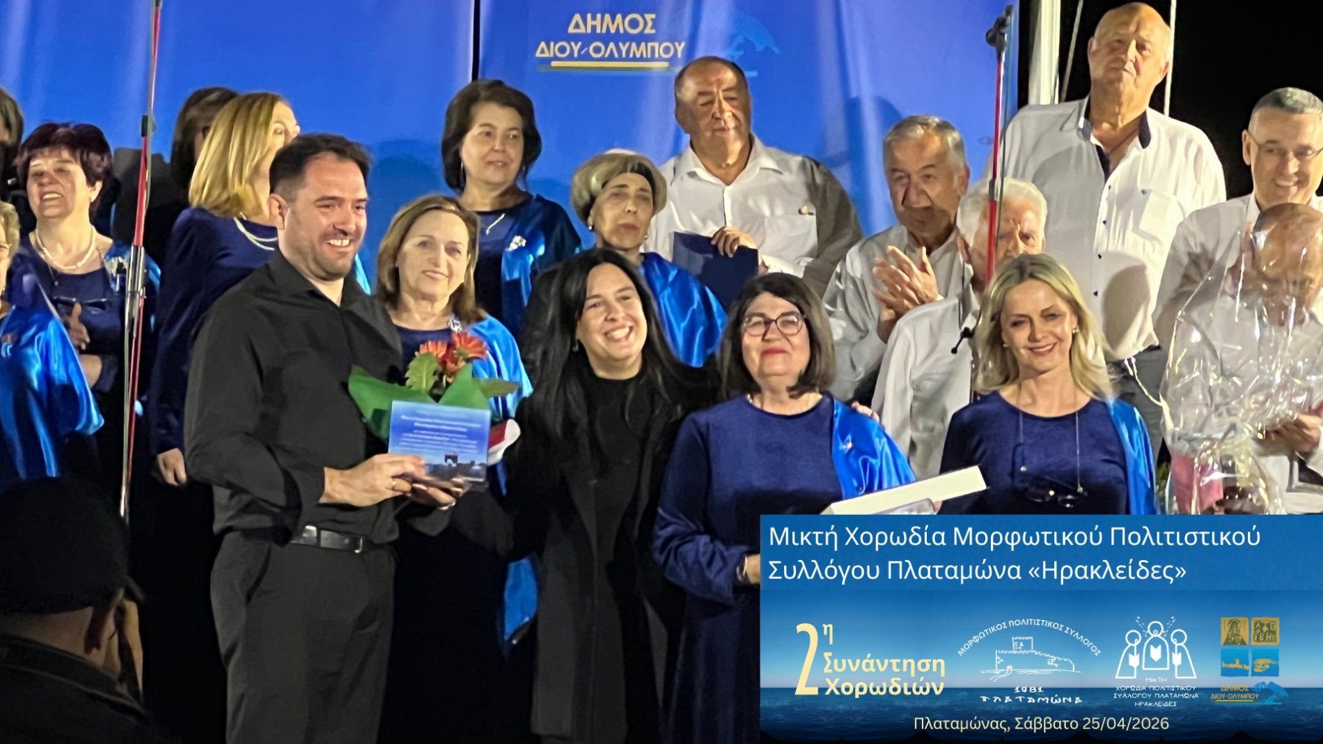 Εντυπωσίασαν το κοινό οι ερμηνείες των έξι χορωδιών που συμμετείχαν στη 2η Συνάντηση Χορωδιών Πλαταμώνα, η οποία διοργανώθηκε το Σάββατο 25 Απριλίου 2026, από τον Μορφωτικό Πολιτιστικό Σύλλογο Πλαταμώνα, τη Μικτή Χορωδία του Πολιτιστικού Συλλόγου Πλαταμώνα «Ηρακλείδες» και τον Δήμο Δίου-Ολύμπου.