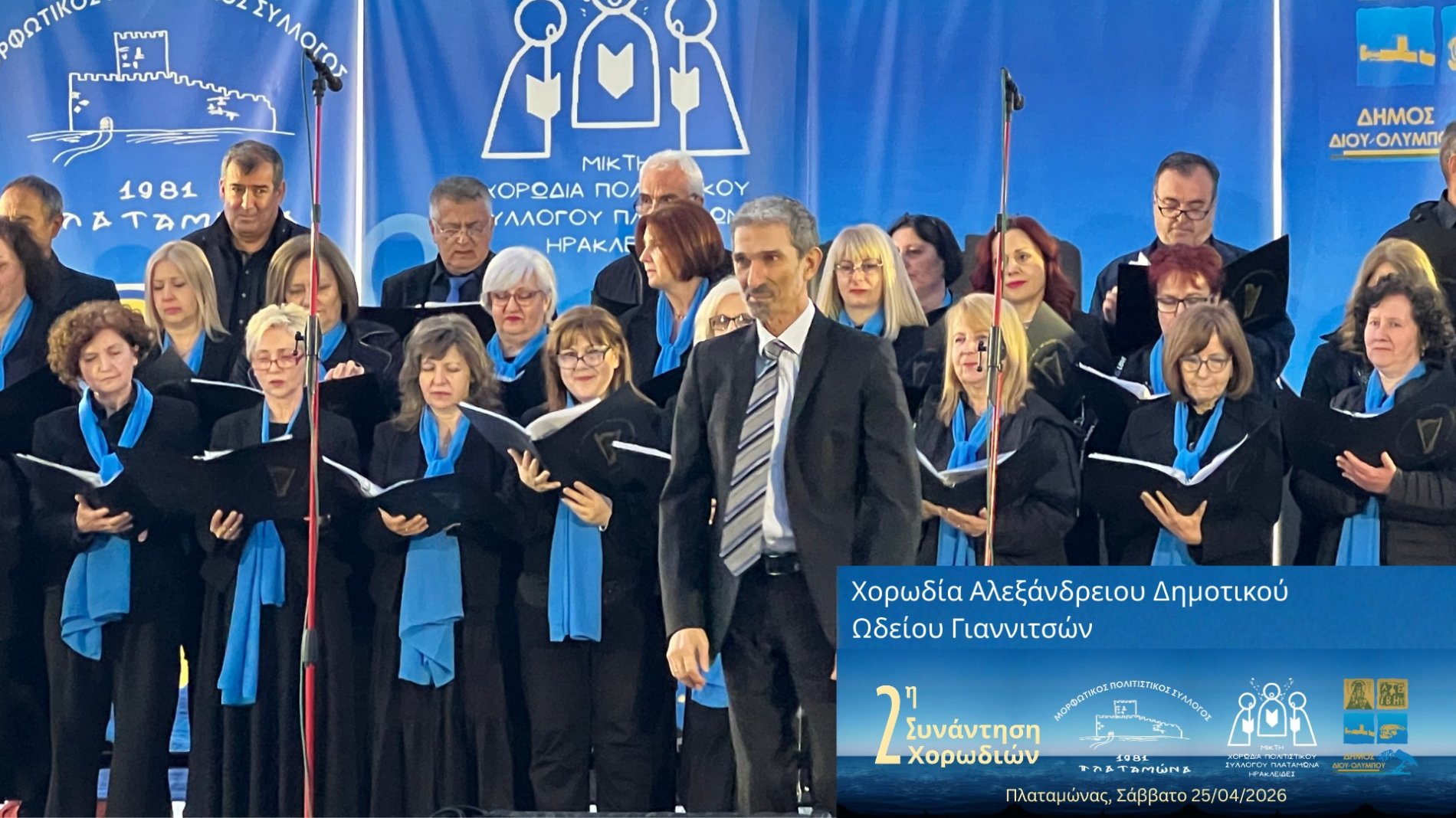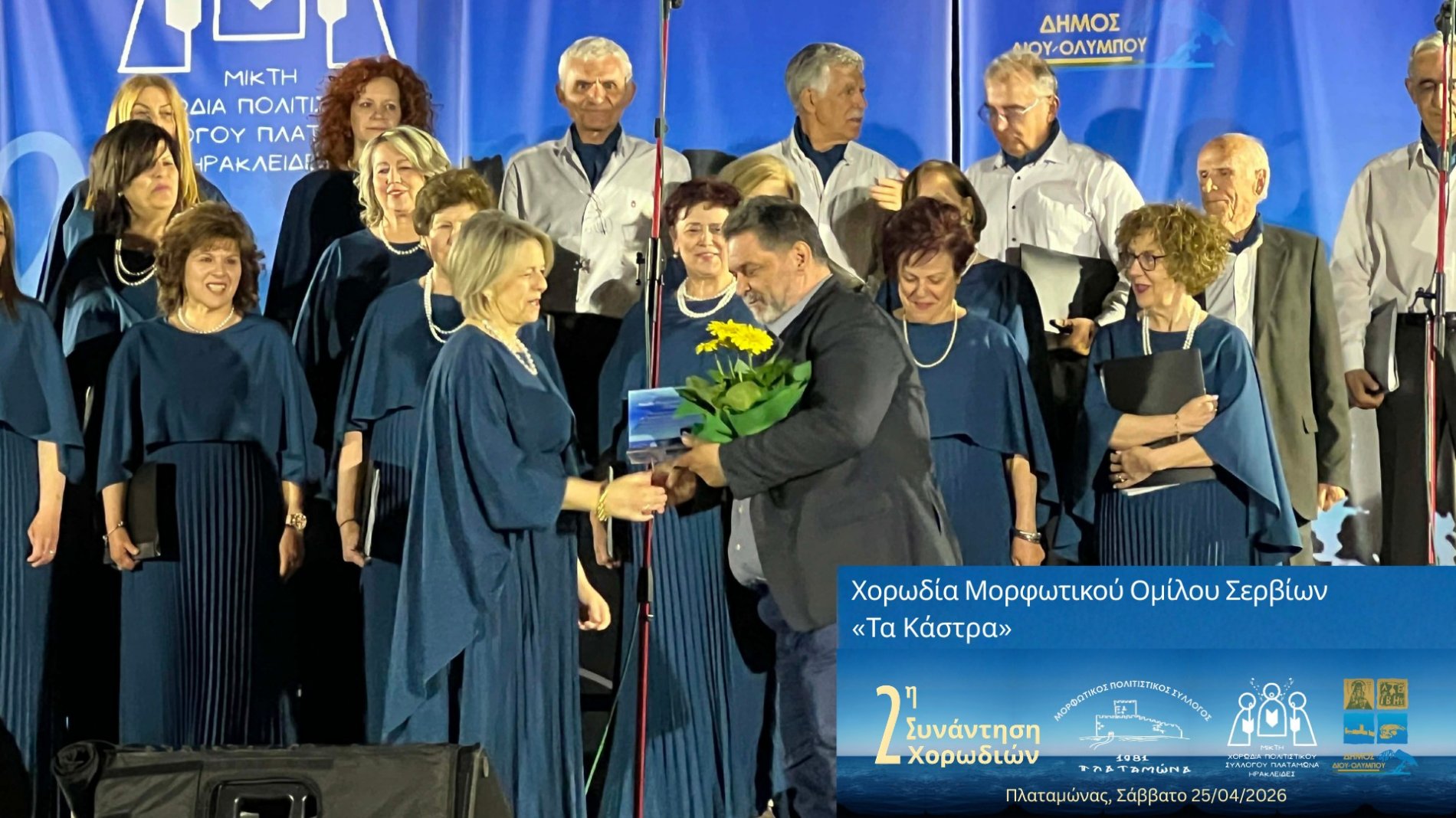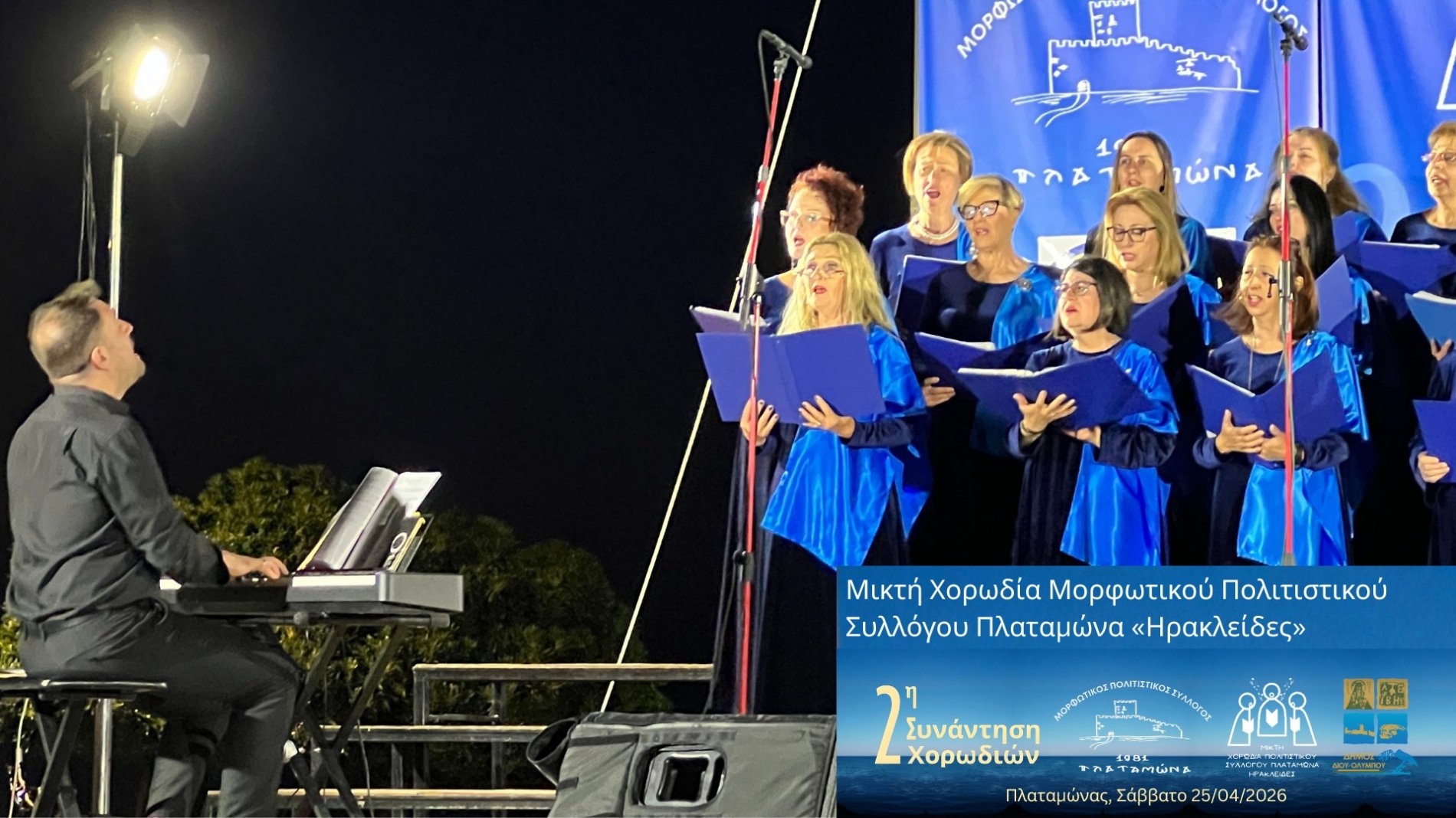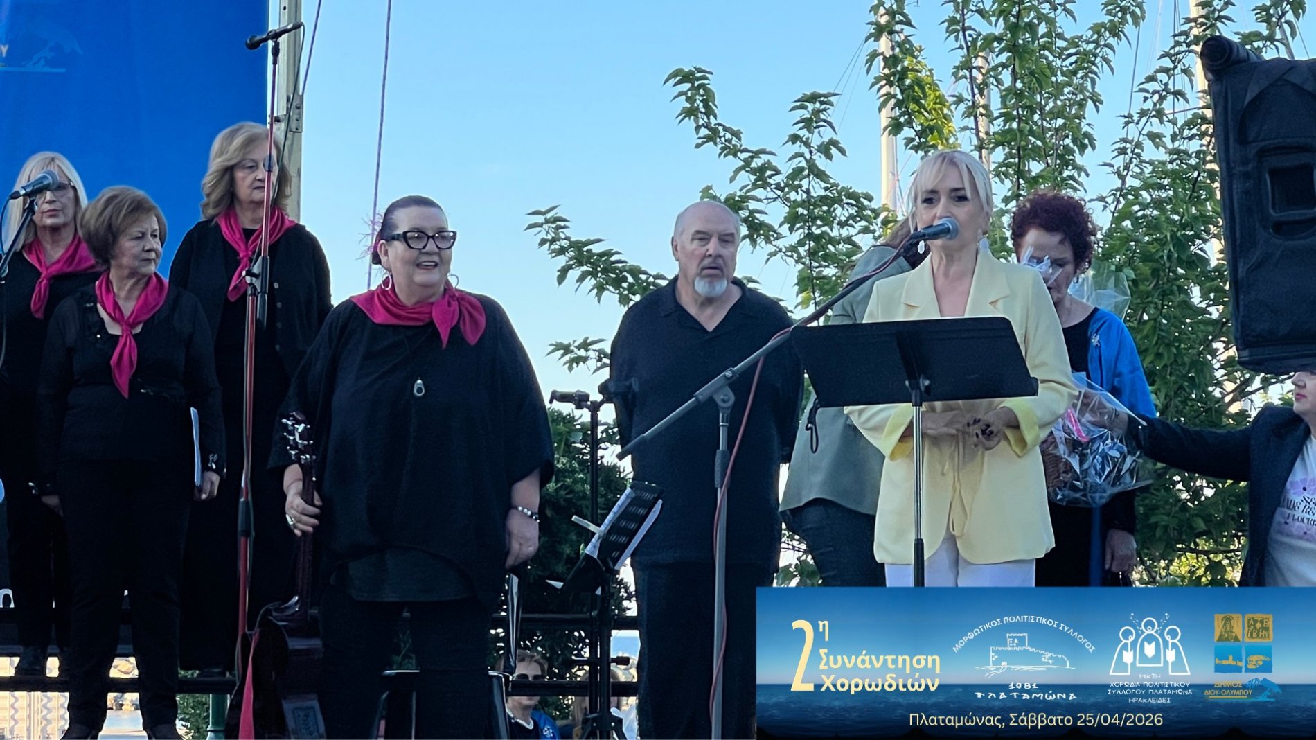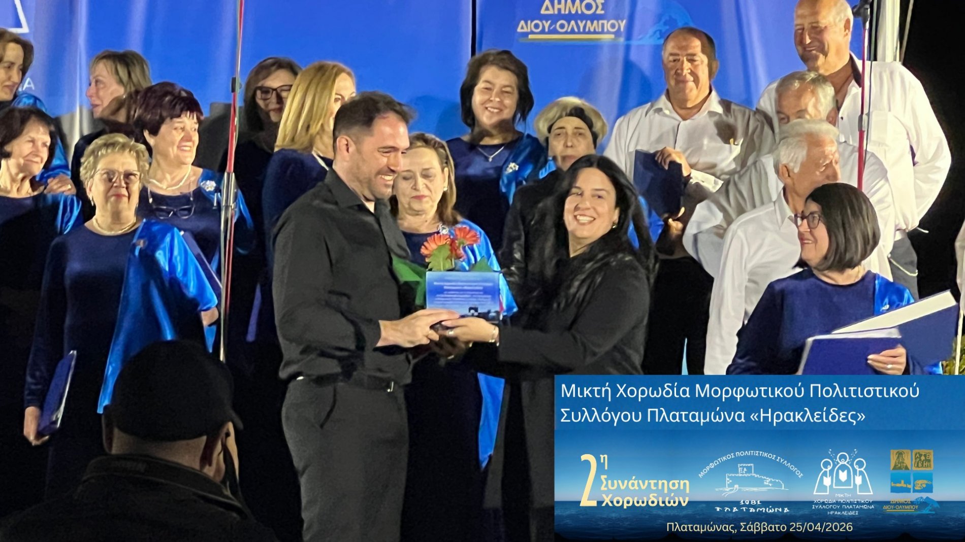 Εντυπωσίασαν το κοινό οι ερμηνείες των έξι χορωδιών που συμμετείχαν στη 2η Συνάντηση Χορωδιών Πλαταμώνα, η οποία διοργανώθηκε το Σάββατο 25 Απριλίου 2026, από τον Μορφωτικό Πολιτιστικό Σύλλογο Πλαταμώνα, τη Μικτή Χορωδία του Πολιτιστικού Συλλόγου Πλαταμώνα «Ηρακλείδες» και τον Δήμο Δίου-Ολύμπου.
