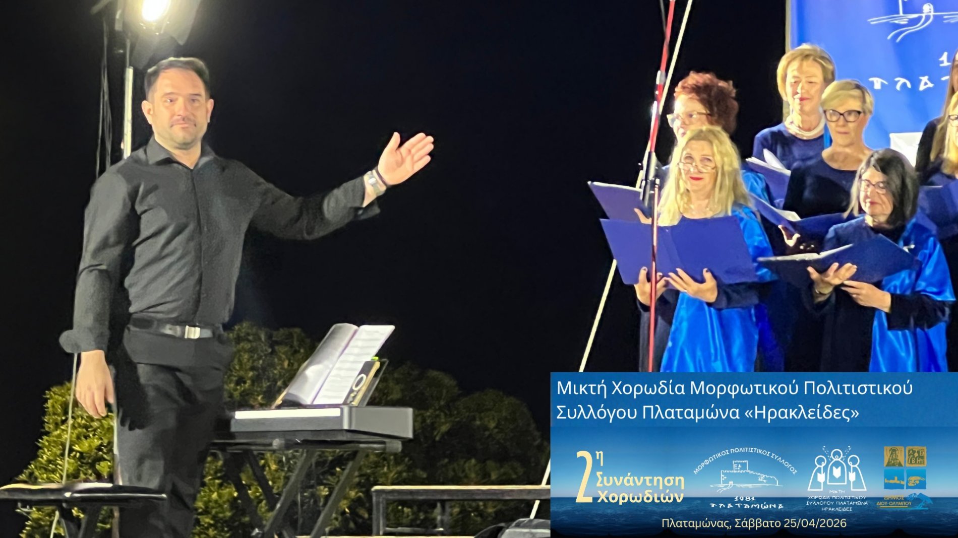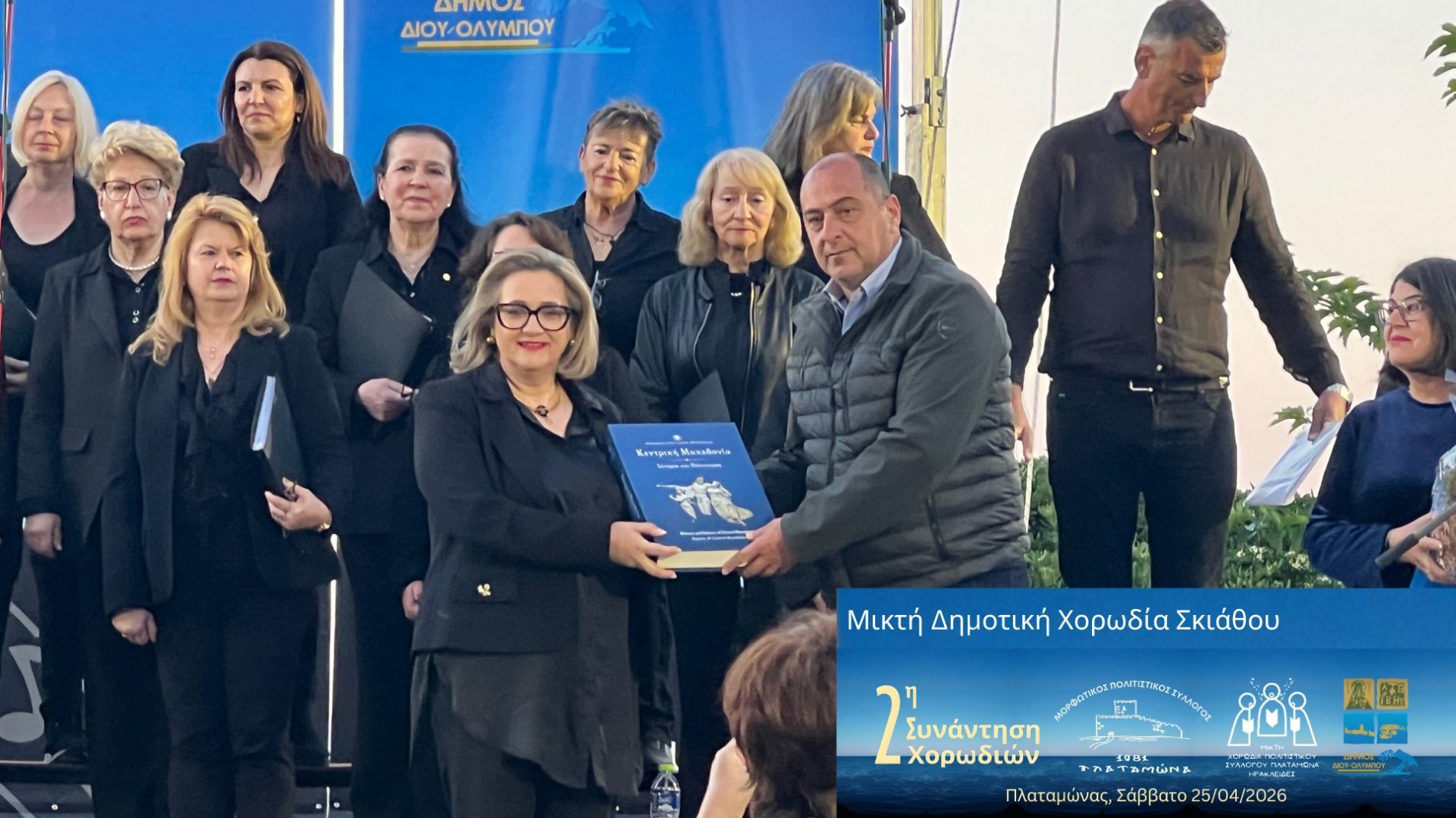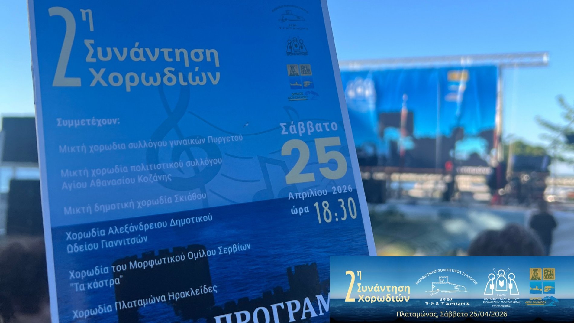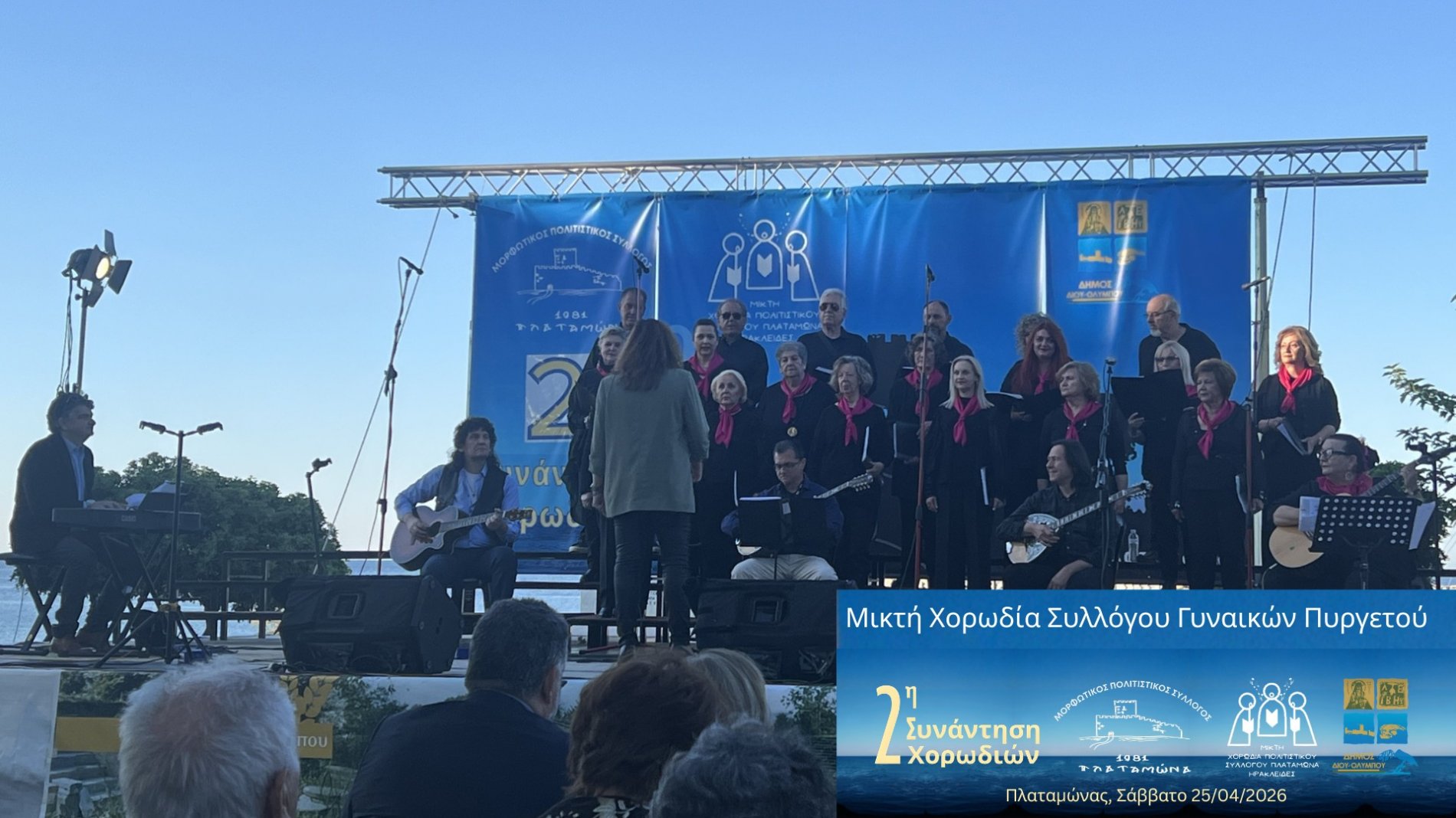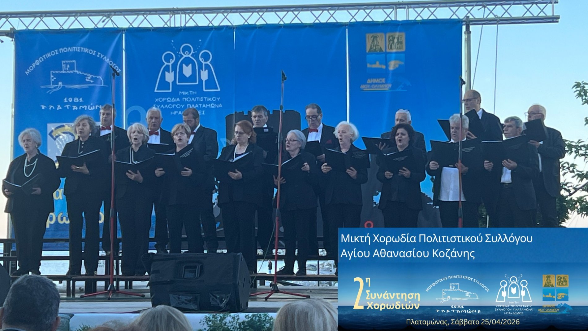Εντυπωσίασαν το κοινό οι ερμηνείες των έξι χορωδιών που συμμετείχαν στη 2η Συνάντηση Χορωδιών Πλαταμώνα, η οποία διοργανώθηκε το Σάββατο 25 Απριλίου 2026, από τον Μορφωτικό Πολιτιστικό Σύλλογο Πλαταμώνα, τη Μικτή Χορωδία του Πολιτιστικού Συλλόγου Πλαταμώνα «Ηρακλείδες» και τον Δήμο Δίου-Ολύμπου.