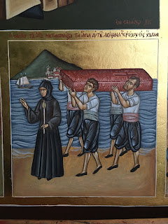 Η μητέρα του Αγίου κατορθώνει και μετακομίζει τα Ιερά λείψανα του αγίου υιού της, που ευωδίαζαν, από την Ρόδο στην Ύδρα.