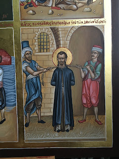 Ο Άγιος χλευάζεται από του Αγαρηνού όχλου, τίπτεται, ξέεται με μεταλλικές ράβδους και ξυλοκοπείται βάναυσα.