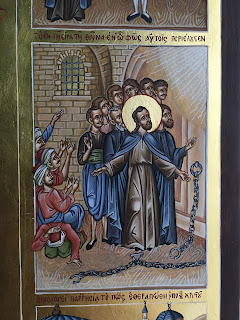 Ο Άγιος σιδηροδέσμιος οδηγείται στην φυλακή, στο Κάστρο των Ιπποτών της Ρόδου, ανάμεσα σε άλλους κακοποιούς και φυλακισμένους.