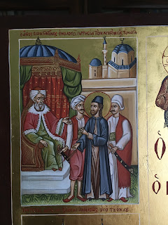 Ο Άγιος παρουσιάζεται με την μοναχική ενδυμασία ενώπιον του Πασά στην Ρόδο, ομολογώντας με παρρησία τον Χριστό. Ο Πασάς δεν τον αναγνωρίζει, βλέποντας δε την φρενήρη υπομονή του τον παραδίδει στον όχλο και κατόπιν τον φυλακίζει ως τρελό, ελπίζοντας ότι ο Κωνσταντίνος θα συνέλθει από την "αφροσύνη" του.