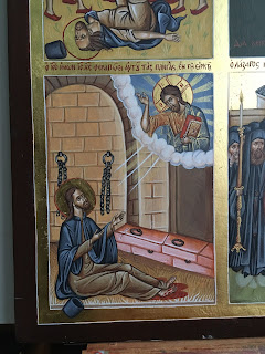 Ο Άγιος Κωνσταντίνος προσεύχεται αιμόφυρτος στην φυλακή. Εκεί τον επισκέπτεται ο Κύριός μας Ιησούς Χριστός, ο οποίος τον ενισχύει και του θεραπεύει τις πληγές στα πόδια και τα πέλματα.